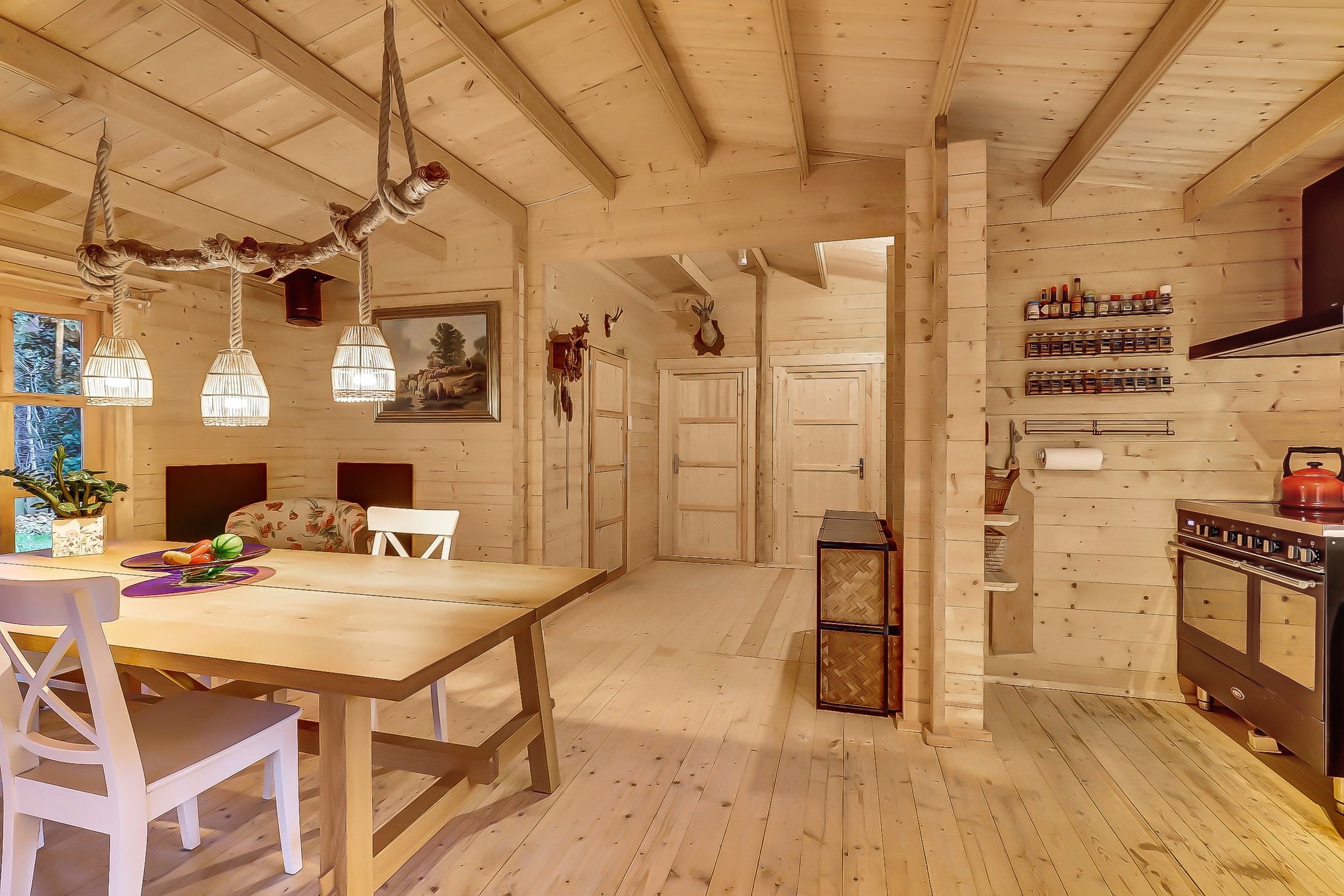 De keukentafel is een grote houten 6-persoonstafel met witte stoelen en bankjes. Het Hue lichtsysteem verlicht de tafel in alle gewenste kleuren en sferen. De lamp bestaat uit een berkentak en visserstouw met 3 lichtpunten omgeven door rieten manden. Een keukenkast uit de jaren twintig maakt het plaatje compleet.