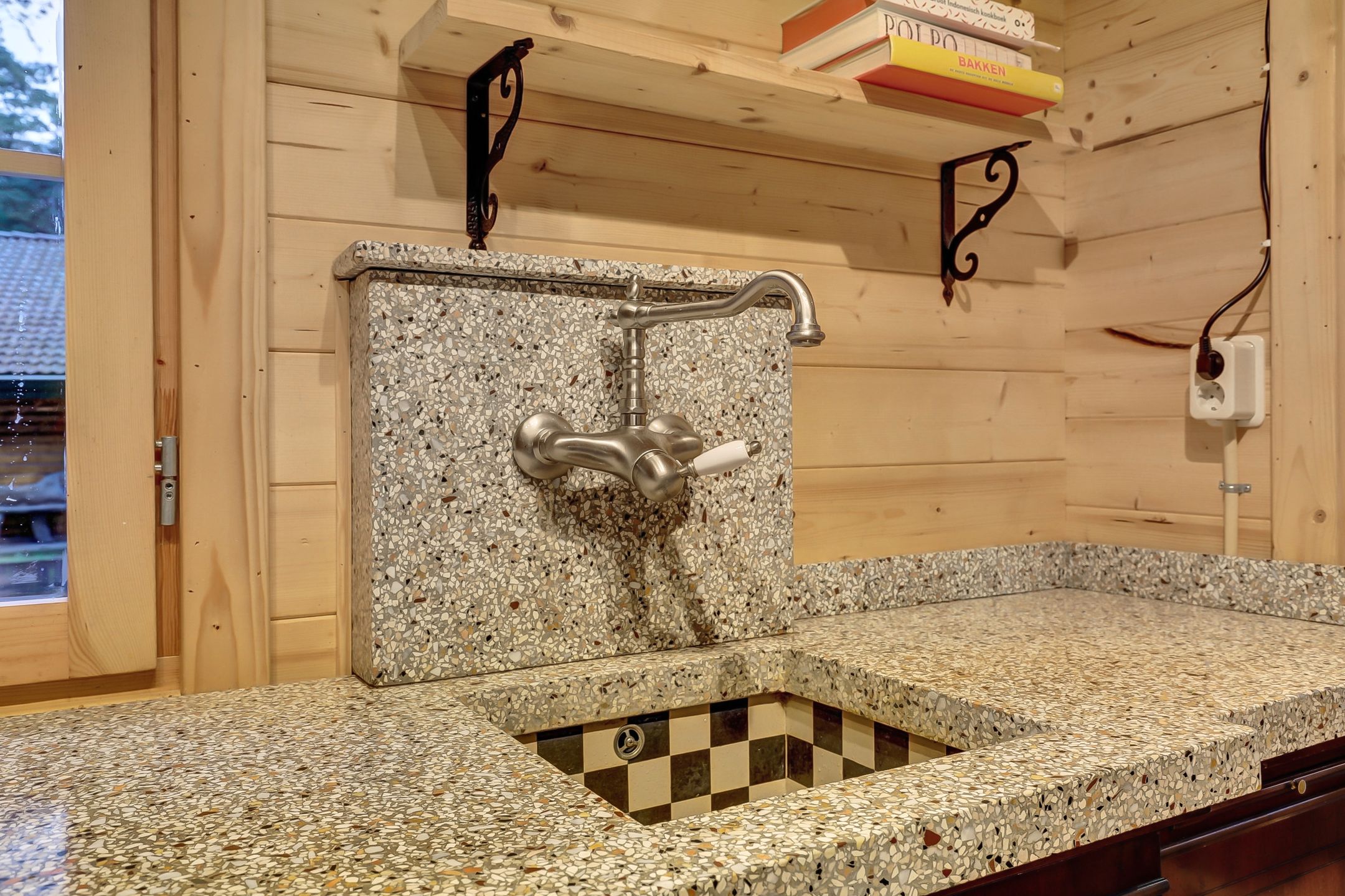 Een andere geliefde plek is de veranda; kalm, rustig en vredig. Vanaf de veranda kom je in de woonkeuken hier hebben we een elektrisch Boretti fornuis staan, bestaande uit 4 kookpunten en 2 ovens. Aangesloten met 3-fasen om de kookpunten en de beide ovens gelijktijdig te gebruiken. Het keukenblok bestaat uit een dressoir van echt hout gemaakt door “de Heldense”. Op dit dressoir ligt een op maat gemaakt keukenblad van terrazzo met een zwart wit geblokte spoelbak en voorzien van een bijpassende klassiek ogende kraan. De plek waar wij graag kokkerellen.