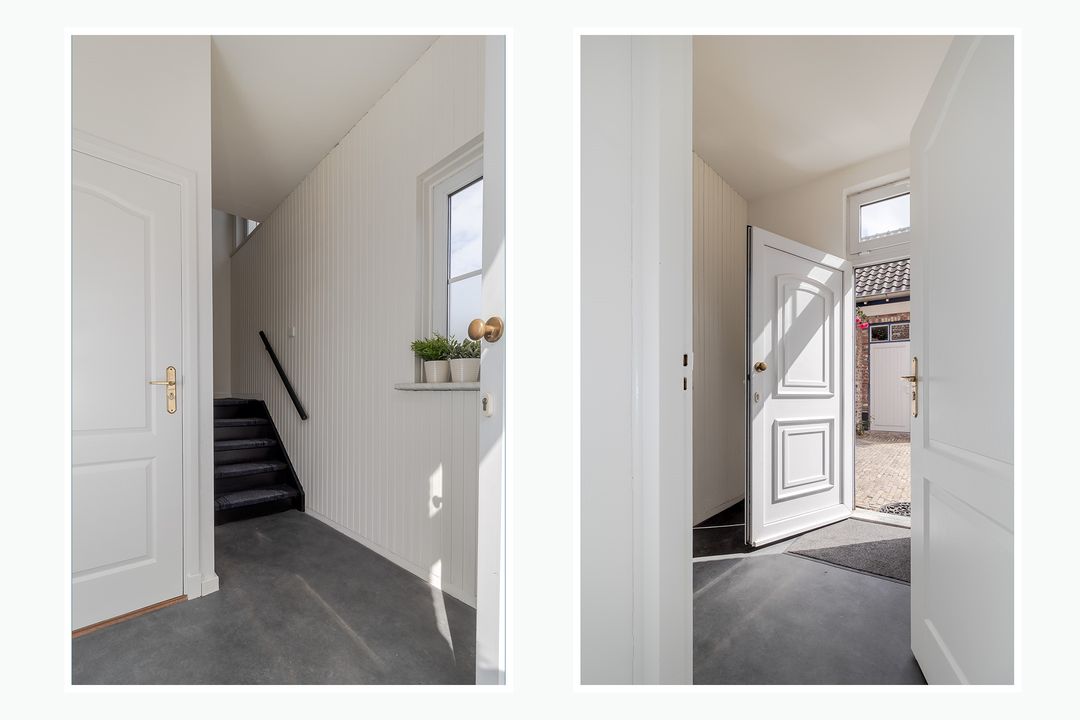 De kleine hal geeft toegang tot de badkamer, opstelling van wasmachine/droger, kelder, woonkamer en de eigen voordeur die uitkomt in de gezamenlijke entree.