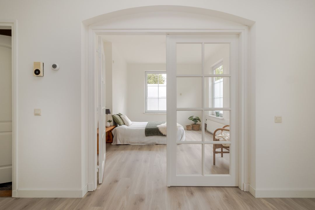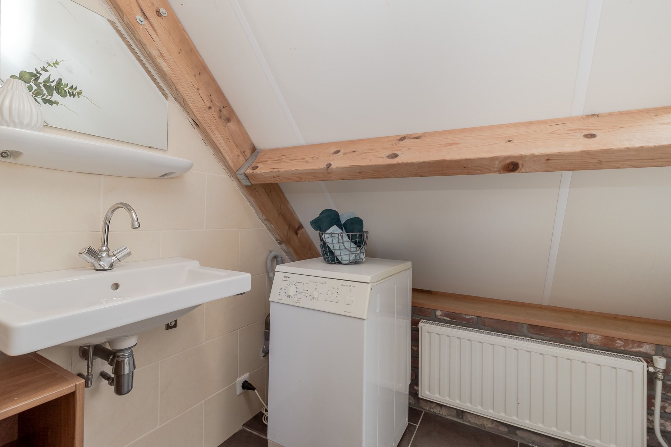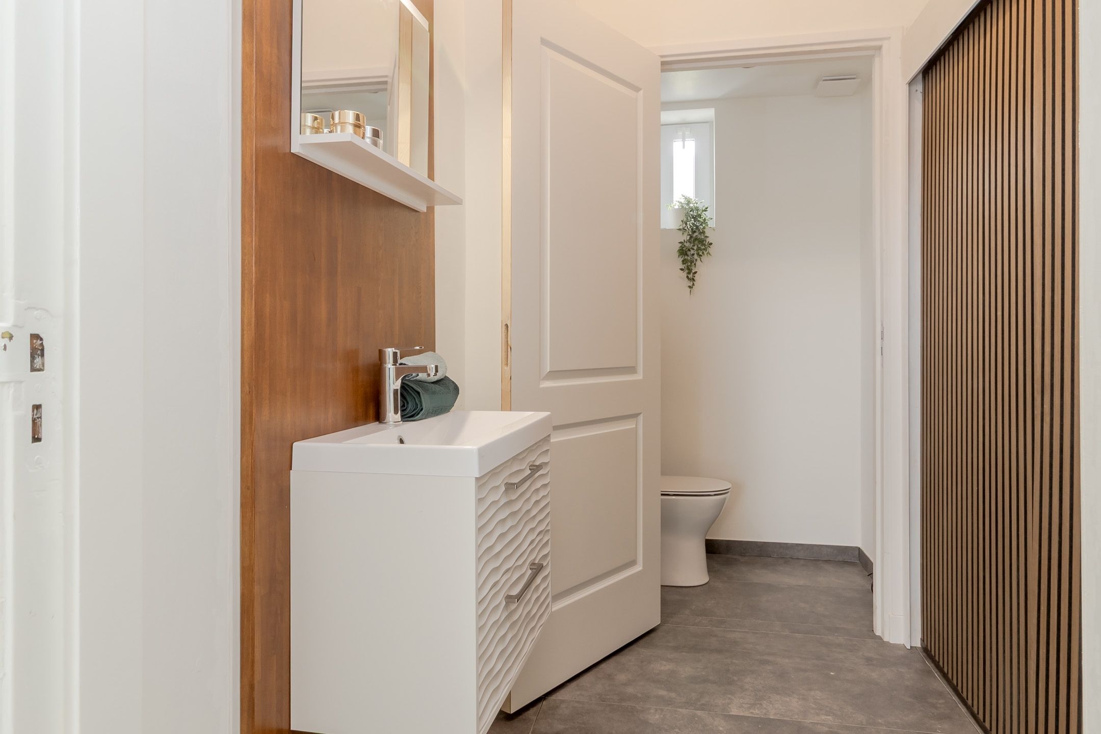 Voldoende bergruimte met wasmachine aansluiting, verborgen achter een modern houten schuifdeur.