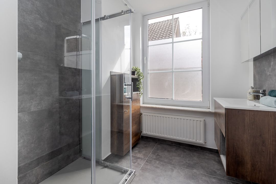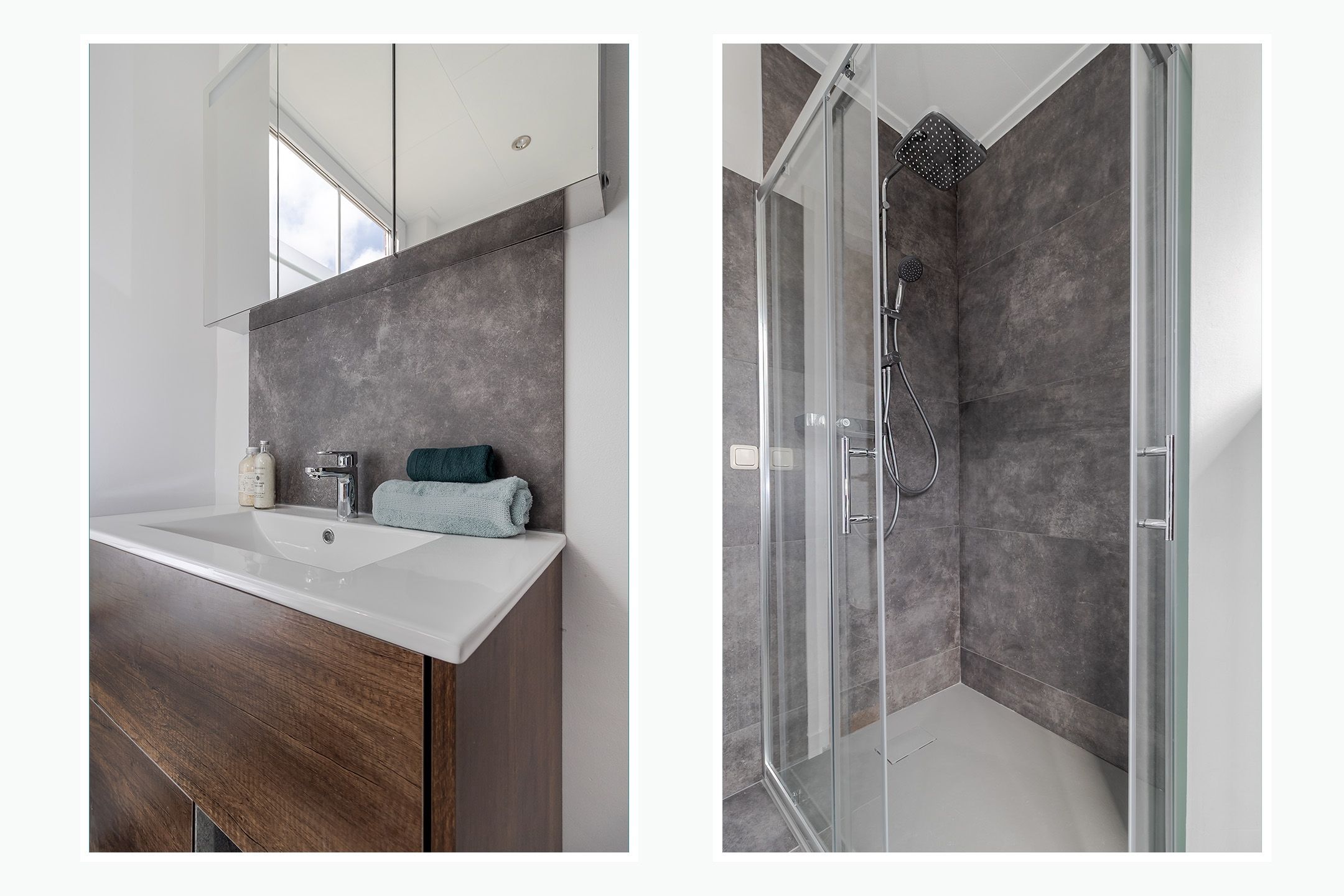 De badkamer is voorzien van een inloopdouche met glazen douchewand, wastafel, onderkast en spiegelkast en een extra kast.