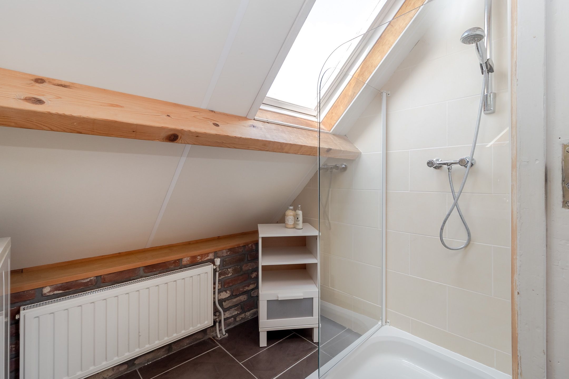 Badkamer: wastafel, wasmachine aansluiting en douche met douchewand