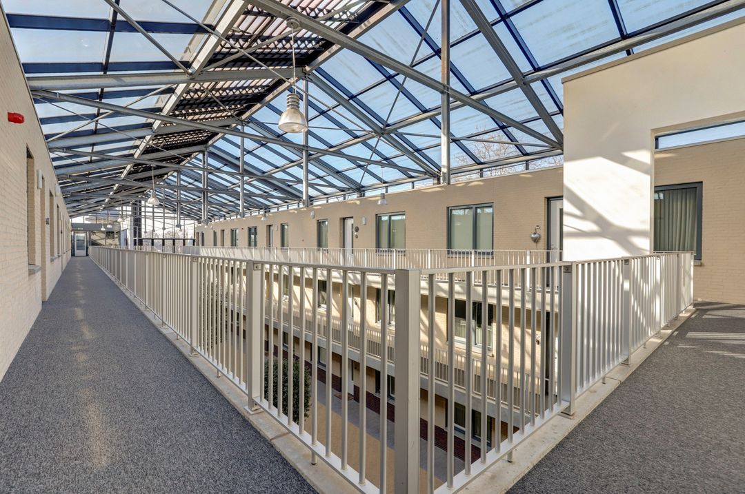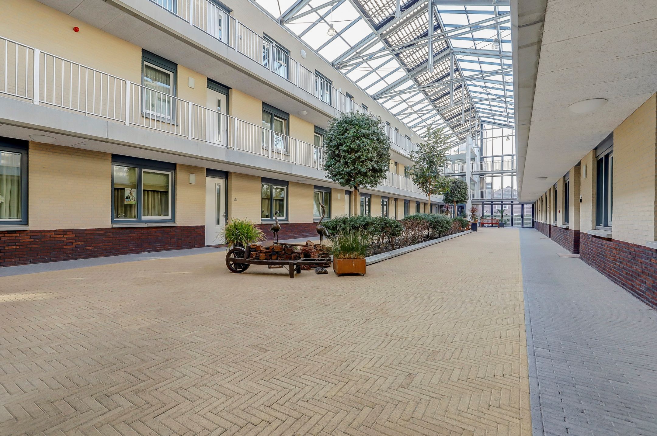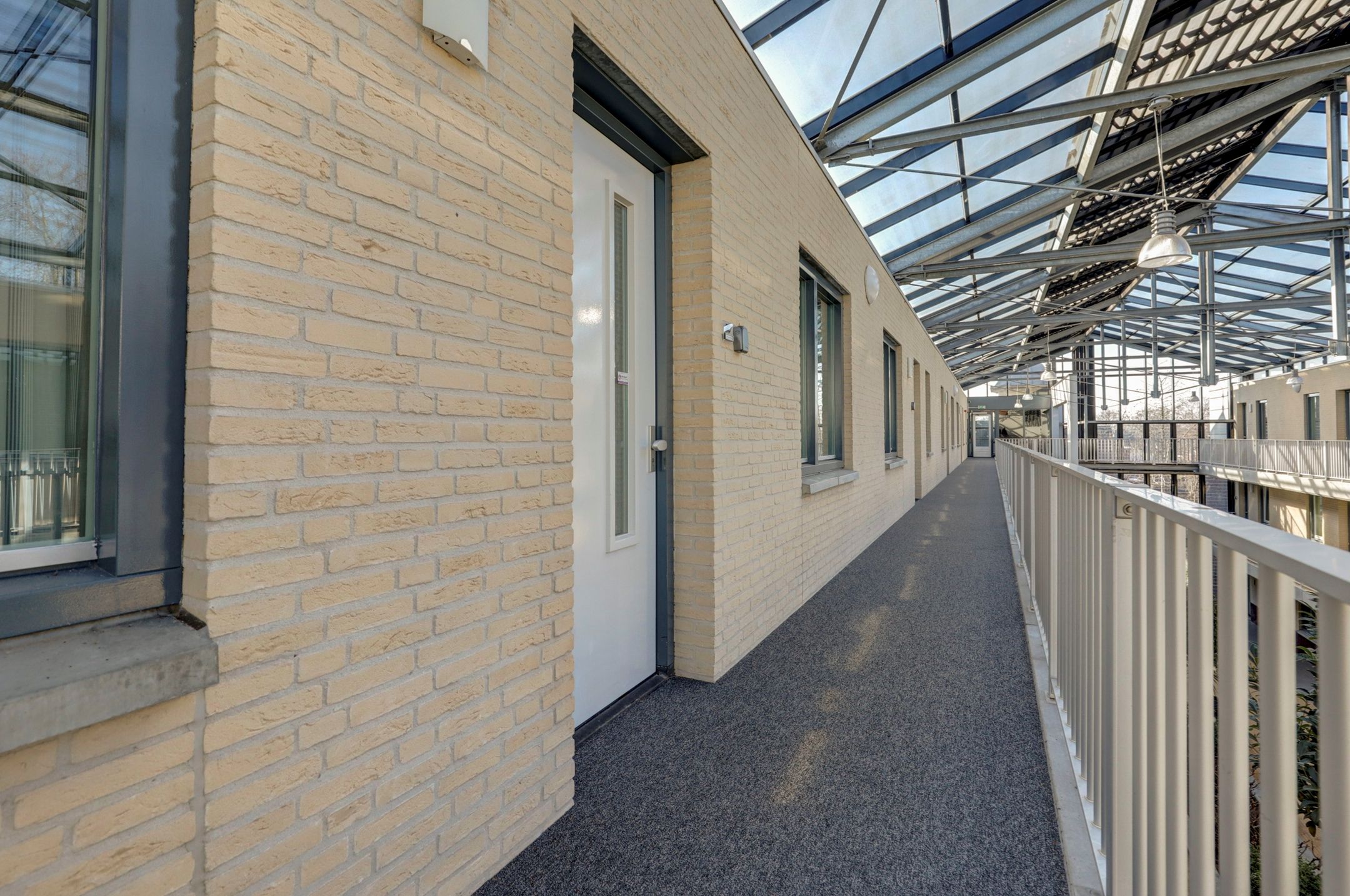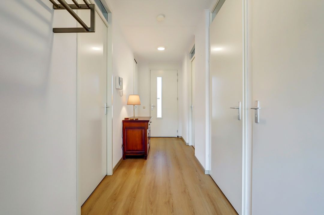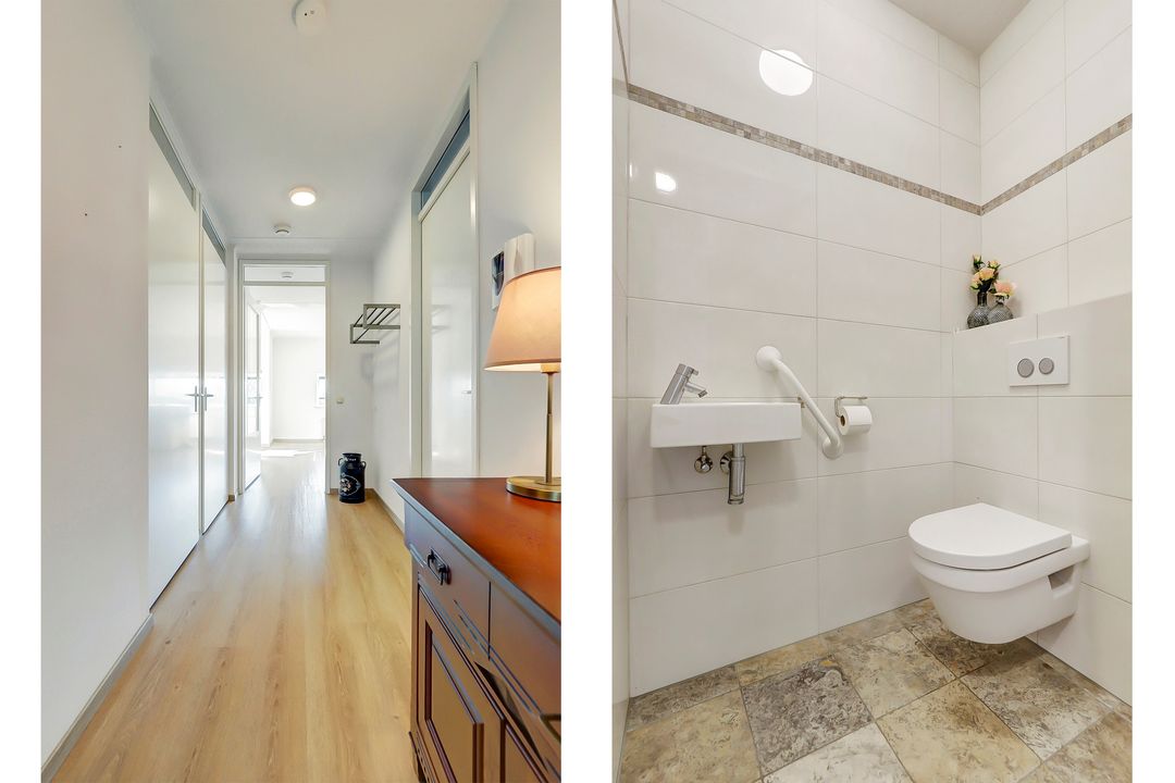 De voordeur van het appartement ligt aan een galerij die uitzicht biedt op de gezamenlijke overdekte binnentuin. De ontvangsthal biedt toegang tot alle kamers en de meterkast. In de meterkast zijn vijf stroomgroepen aanwezig met dag- en nachtstroom en de aansluiting voor het glasvezelinternet. In de separate toiletruimte is een hangcloset en een fonteintje aanwezig. De vloer bevat grijze tegels en de wanden zijn voorzien van witte tegels met een mozaïekrandje. De ontvangsthal bevat grey wash PVCvloer dat drempelloos is doorgelegd naar de slaapkamers en woonkamer en alle wanden bevatten stucwerk.