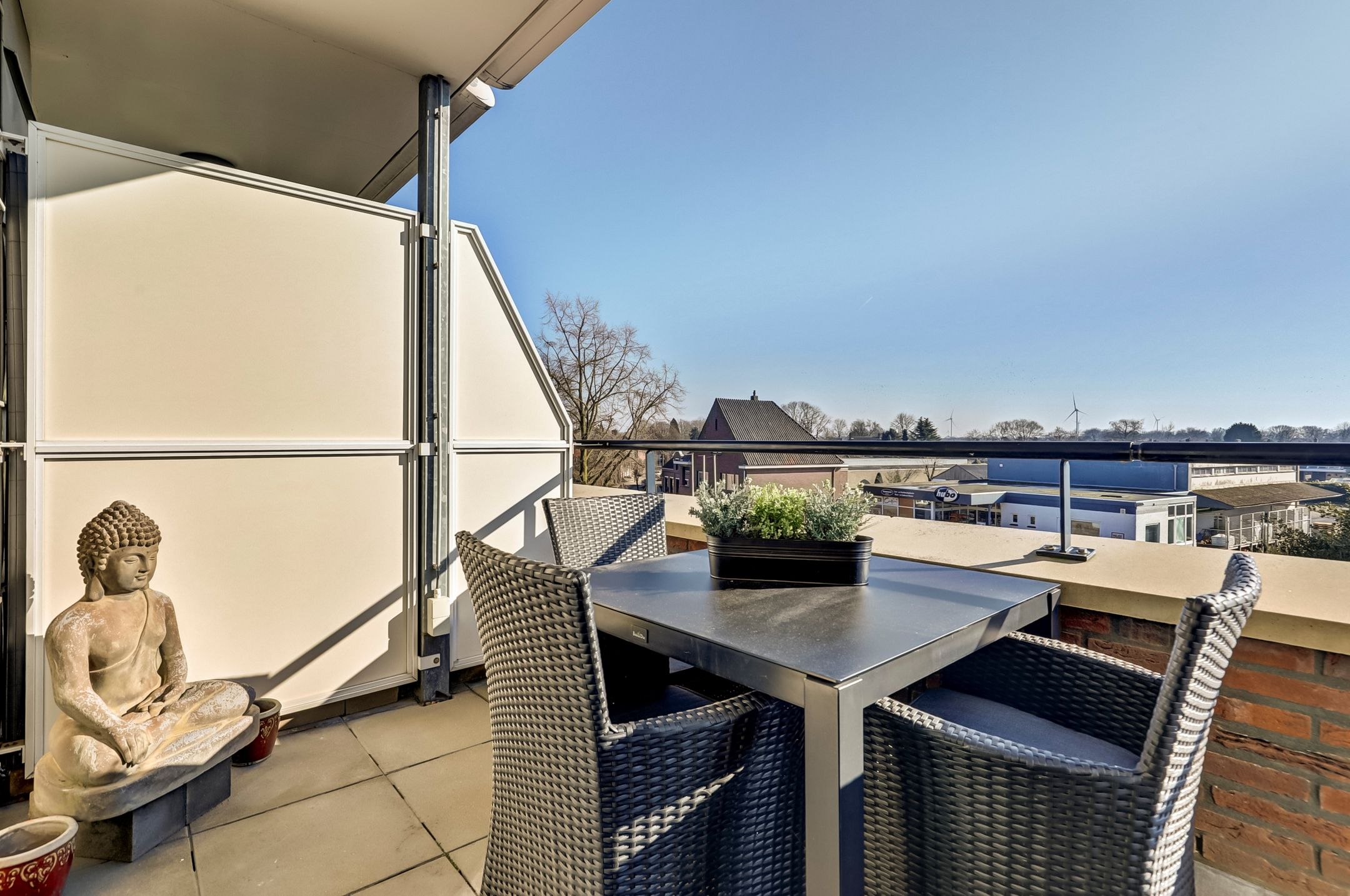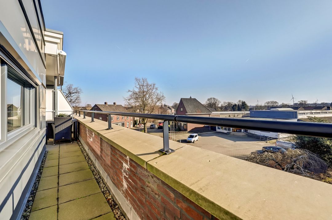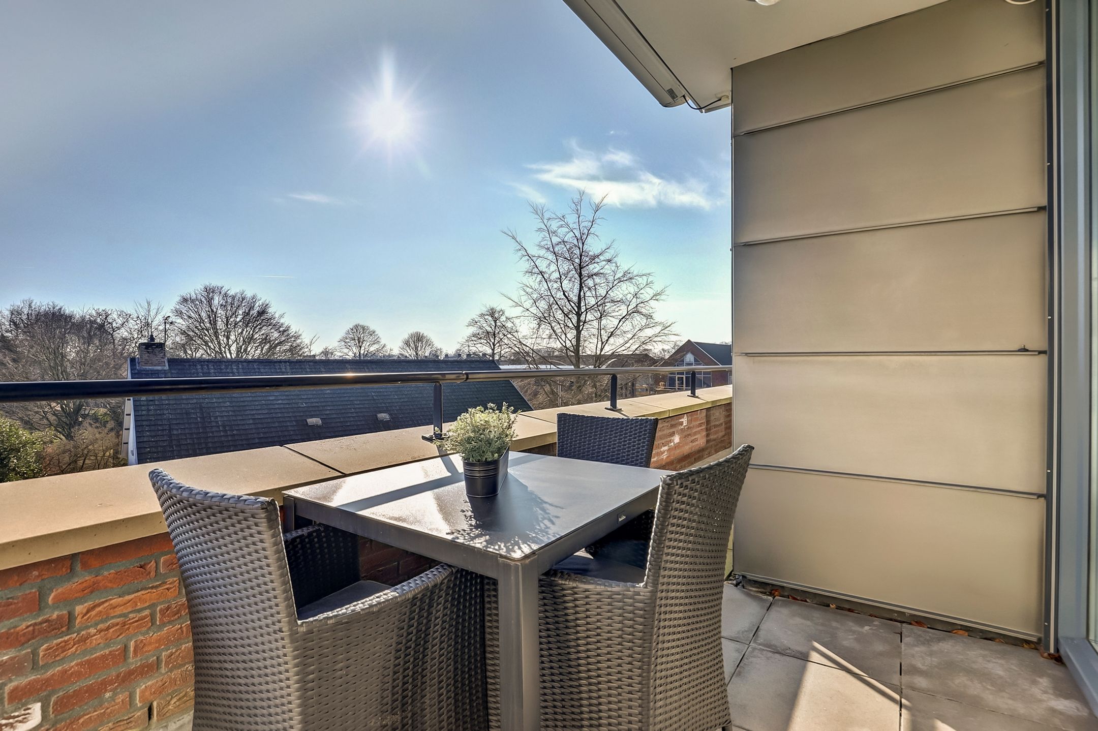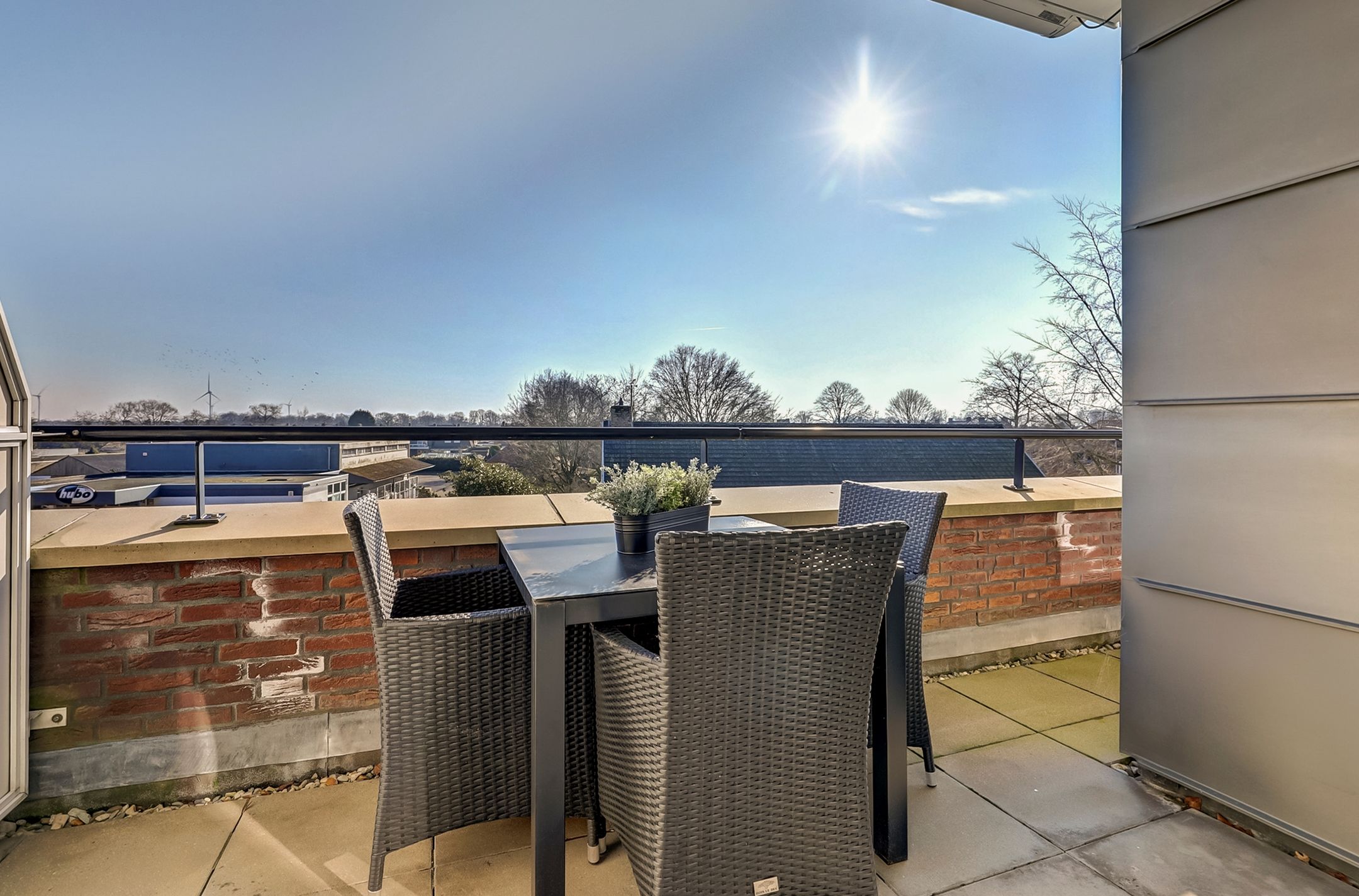 Het balkon beslaat de gehele breedte van het appartement en heeft een overkapping bij het terras met zonnescherm. Je kunt hier heerlijk zitten met een fijn uitzicht over Meijel.