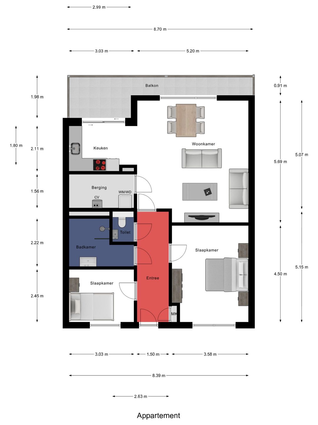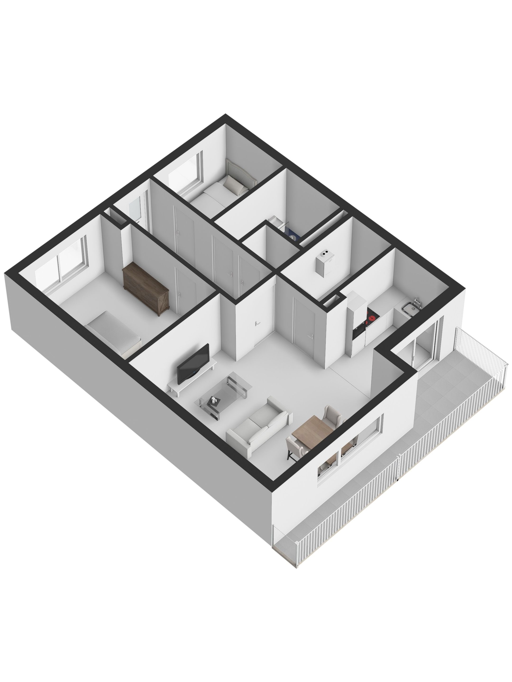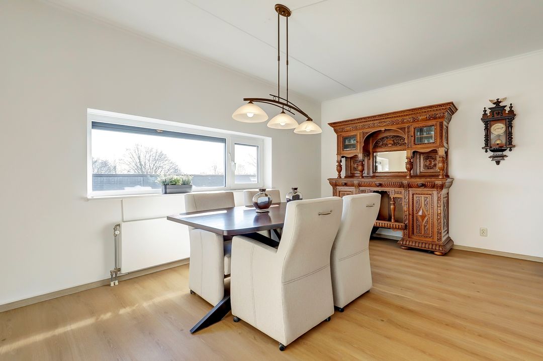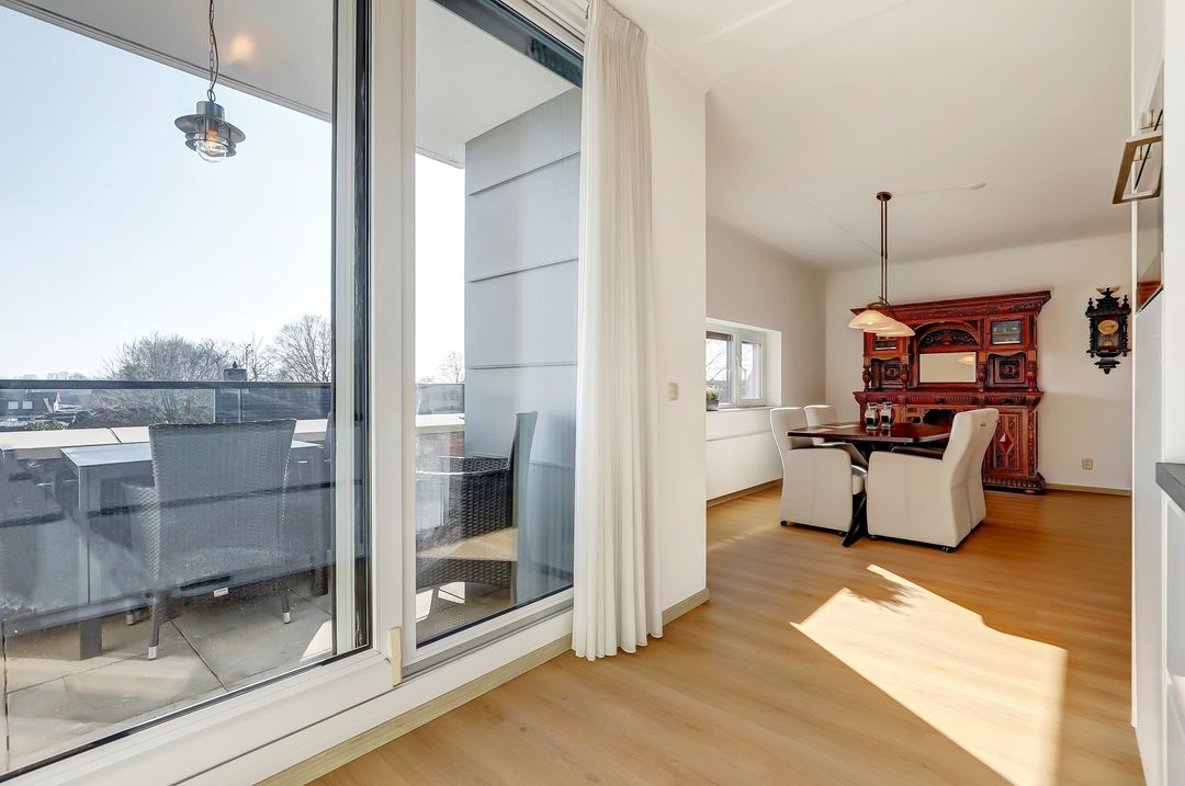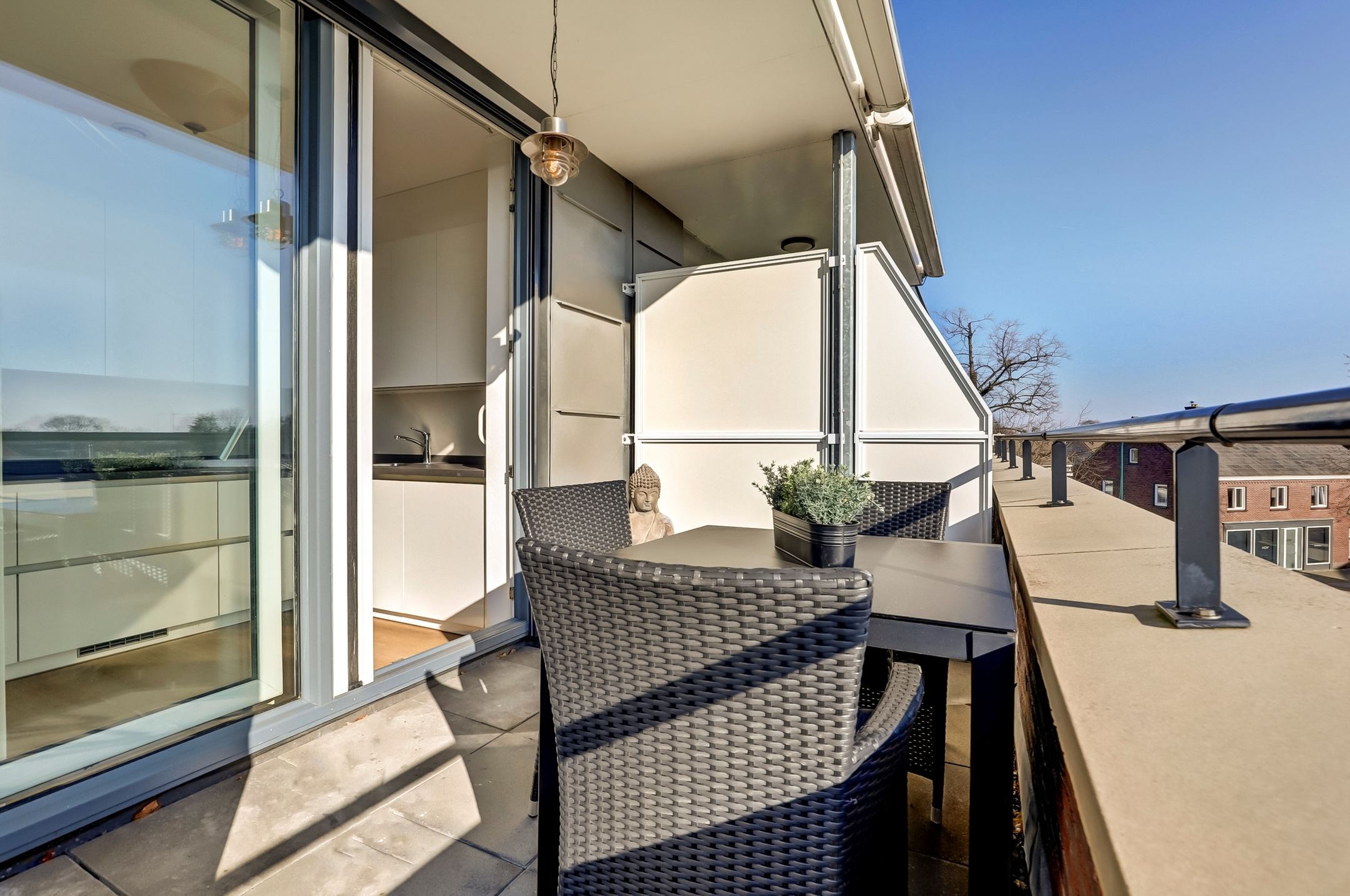 Het balkon beslaat de gehele breedte van het appartement en heeft een overkapping bij het terras met zonnescherm. Je kunt hier heerlijk zitten met een fijn uitzicht over Meijel.