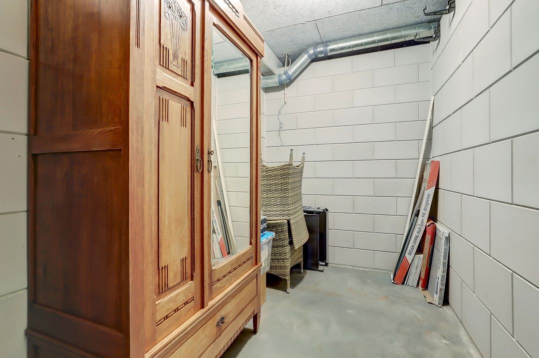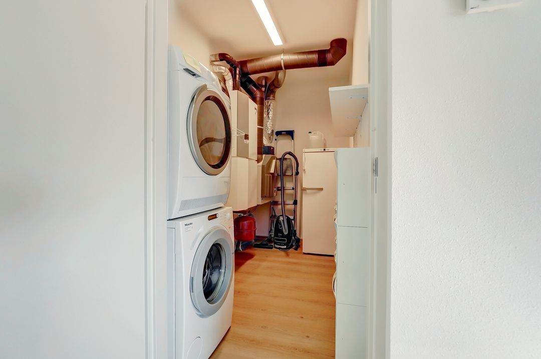 In de woonkamer is ook een deur aanwezig die toegang geeft tot een wasruimte/voorraadkast. In deze ruimte is een witgoedaansluiting aanwezig. Tevens bevindt zich hier de Nefit Ecomline HR ketel uit 2008 en de WTW-installatie.
