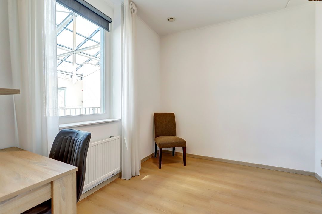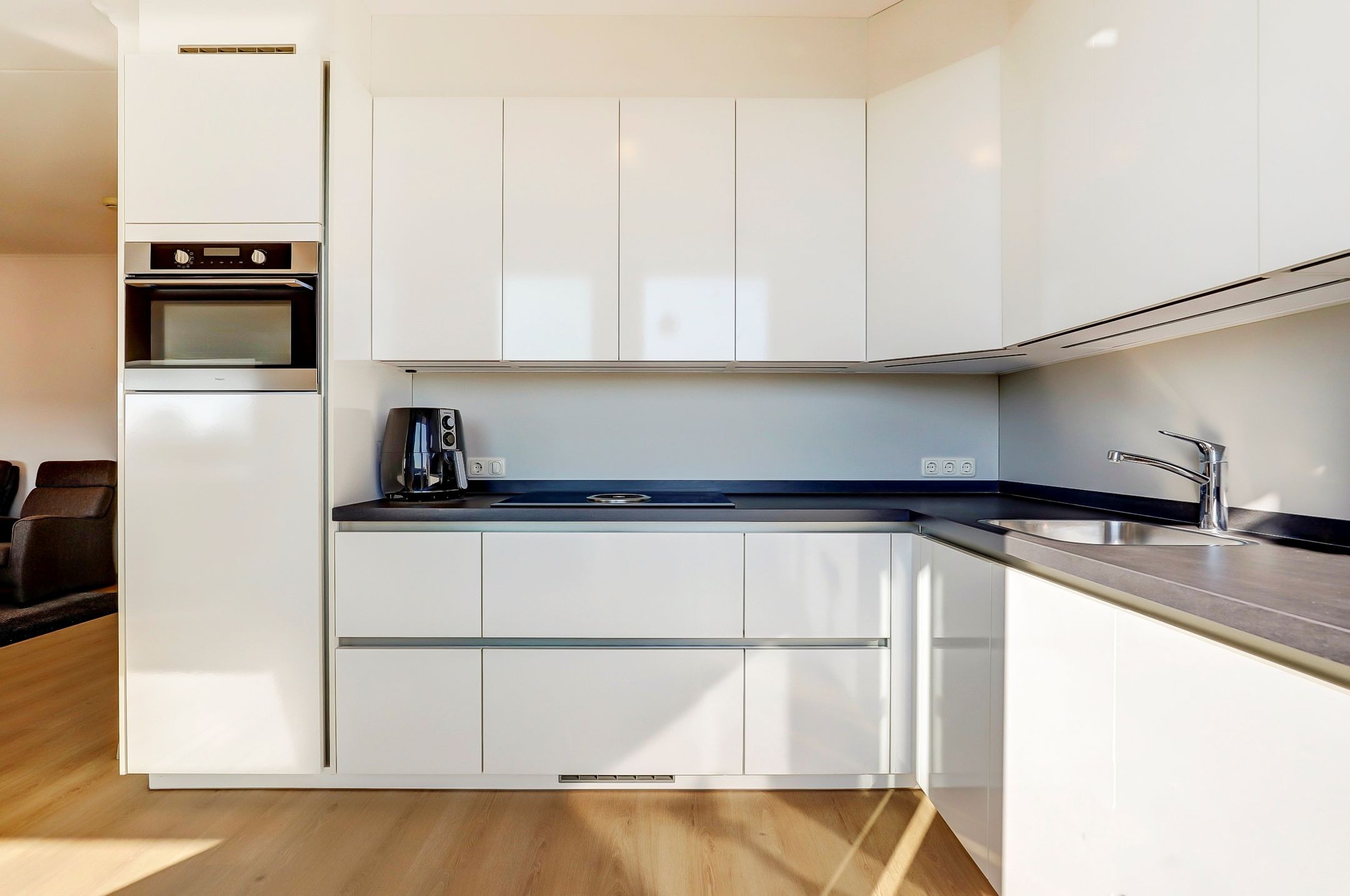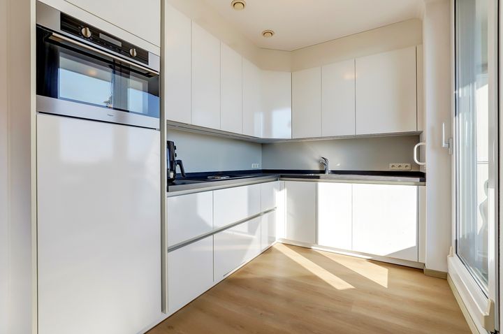 De luxueus ingerichte L-vormige open keuken is van alle gemakken voorzien. Er is een vierpits inductiefornuis aanwezig met geïntegreerde afzuiging, een combi-oven, een vaatwasser en een koelkast. Het aanrechtblad van zwarte graniet, wat niet alleen slijtvast is maar ook makkelijk schoon te maken. De witte hoogglans keukenkastjes zijn van massief hout en hebben allemaal een soft-close sluiting. Via een schuifpui, die ook een kiepstand heeft, is het balkon toegankelijk.