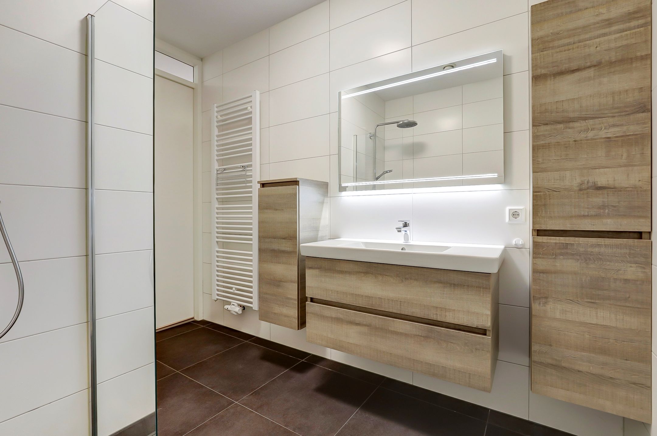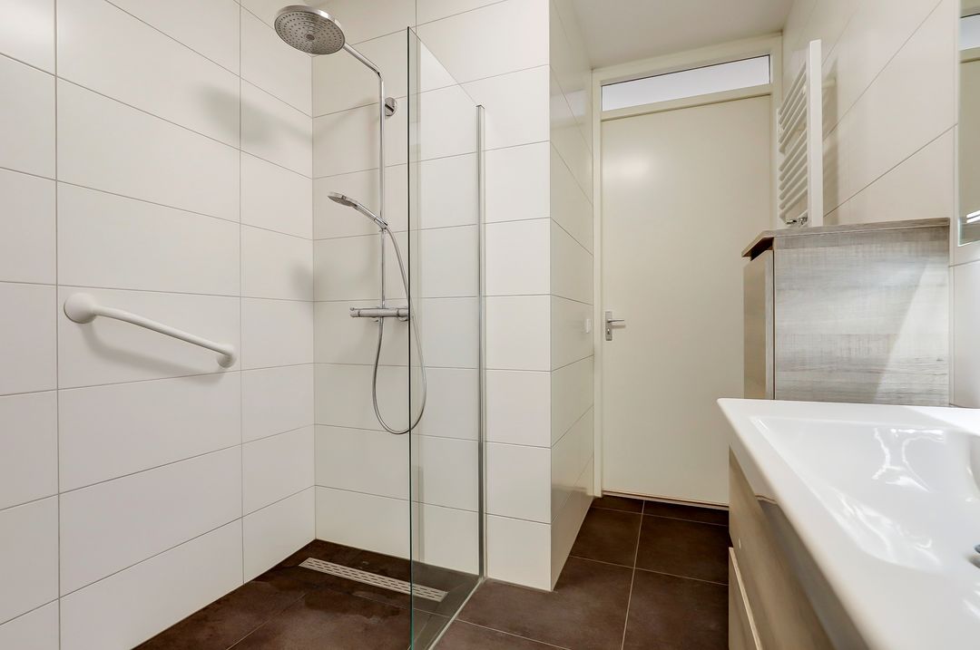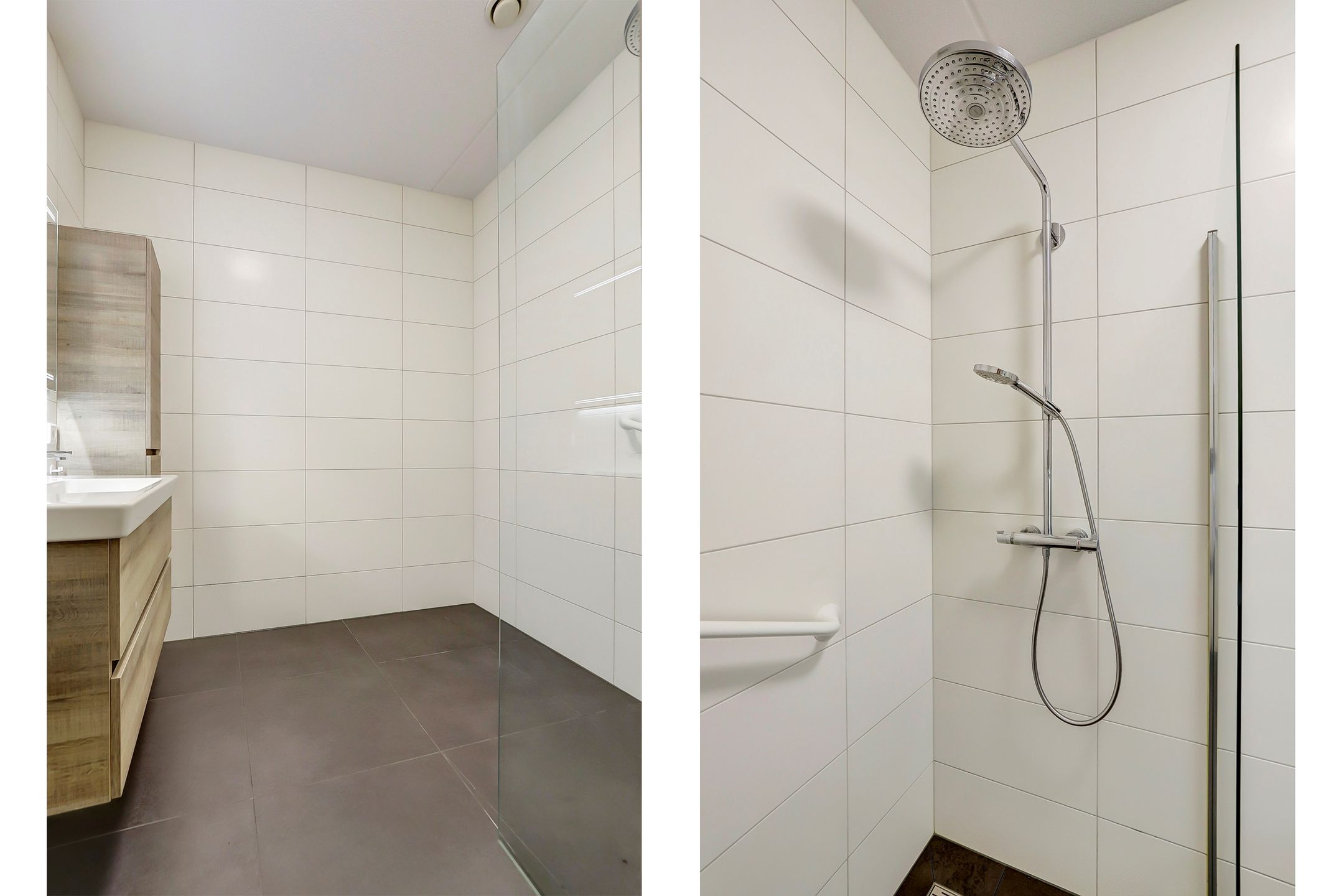 In deze fijne badkamer met grote inloopdouche met een glazen scherm kun je heerlijk ontspannen. Er is een wastafel aanwezig met een grote lade en een badkamermeubel waar je handdoeken en douchespullen in kwijt kunt. Op de designradiator kun je de handdoeken drogen en er is mechanische ventilatie aanwezig. Op de vloer liggen donkere tegels met vloerverwarming en de wanden zijn geheel betegeld met een strakke, witte tegel.