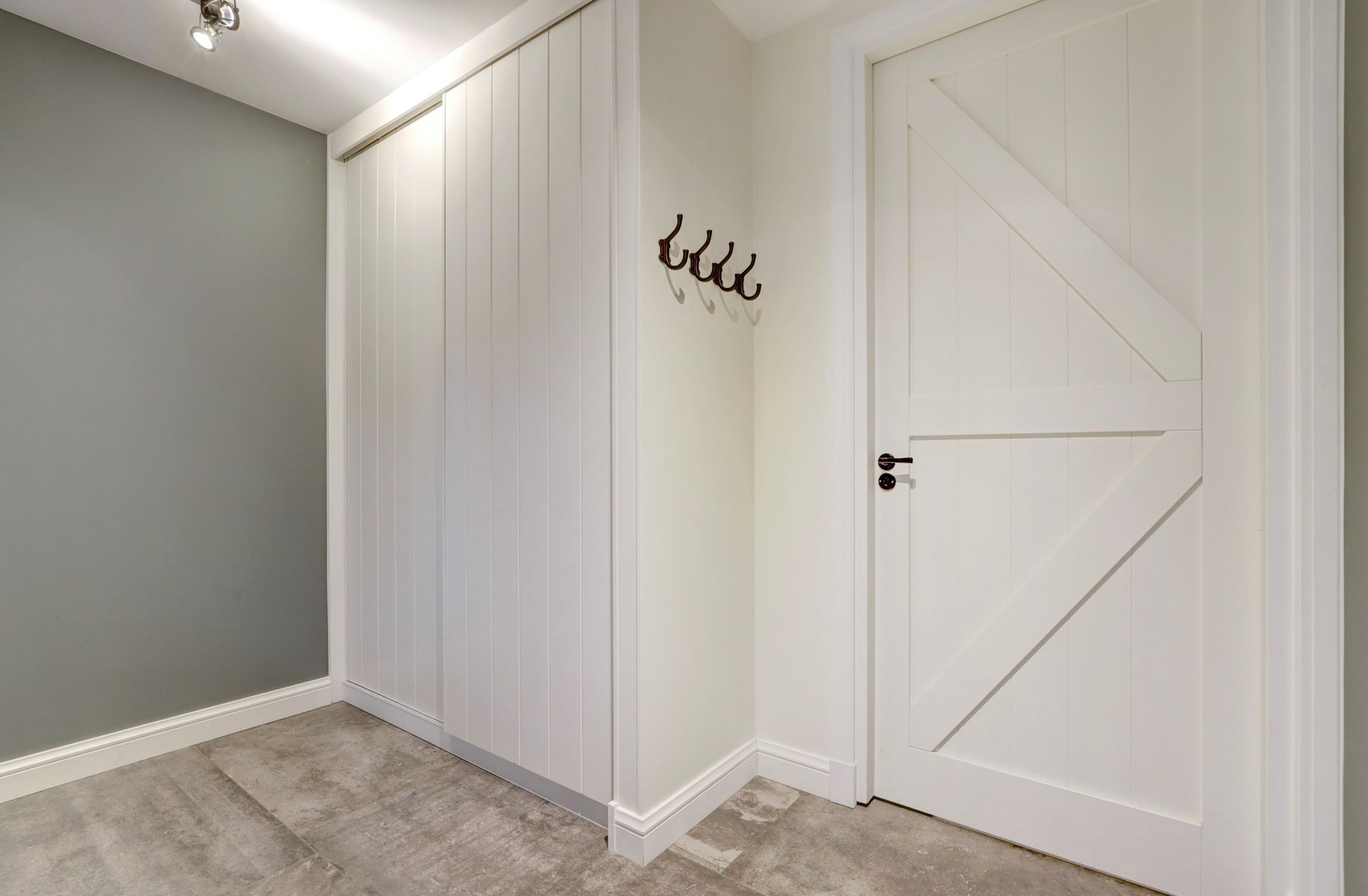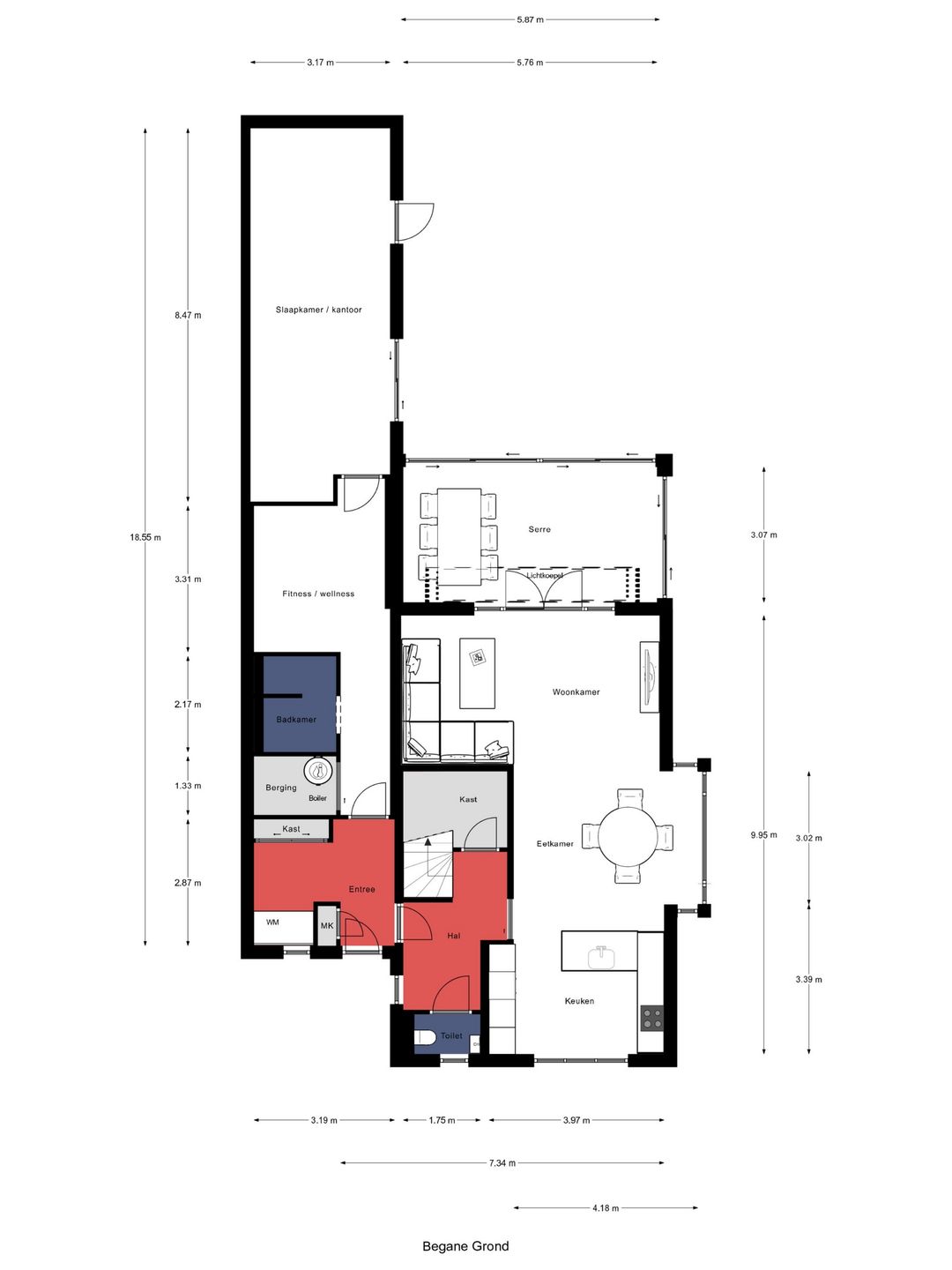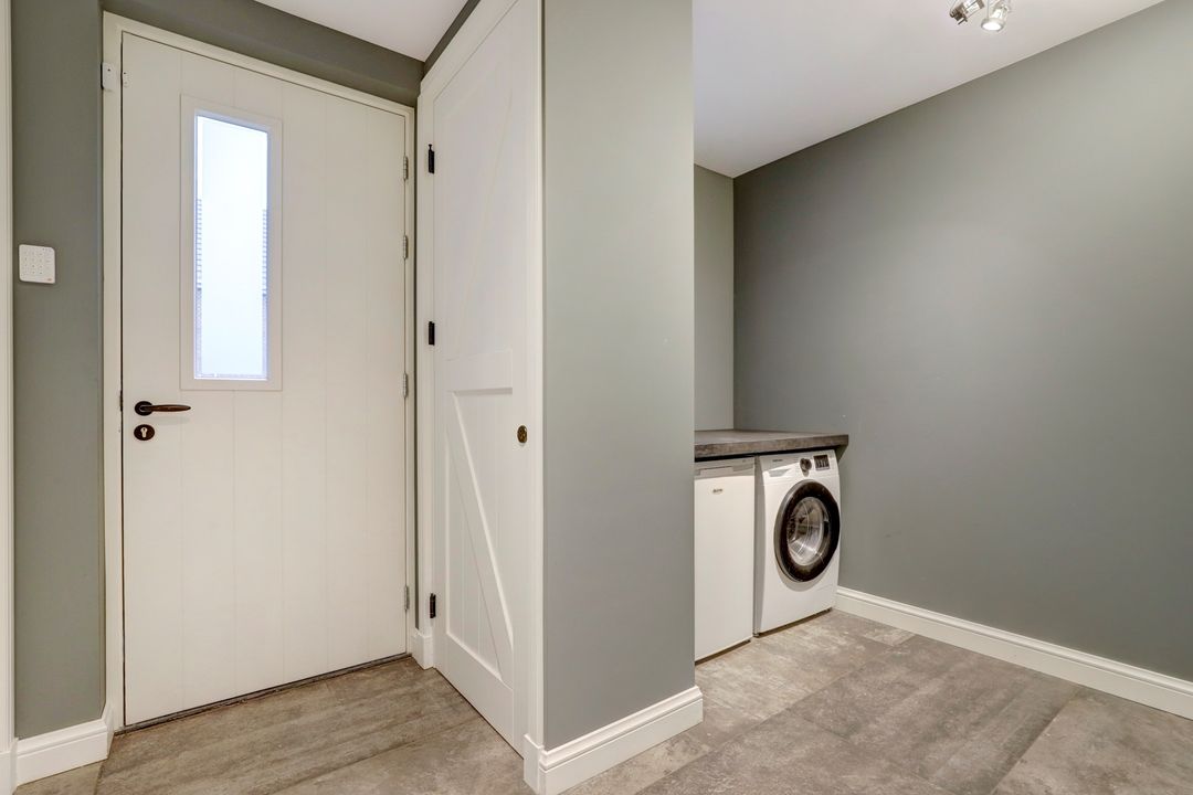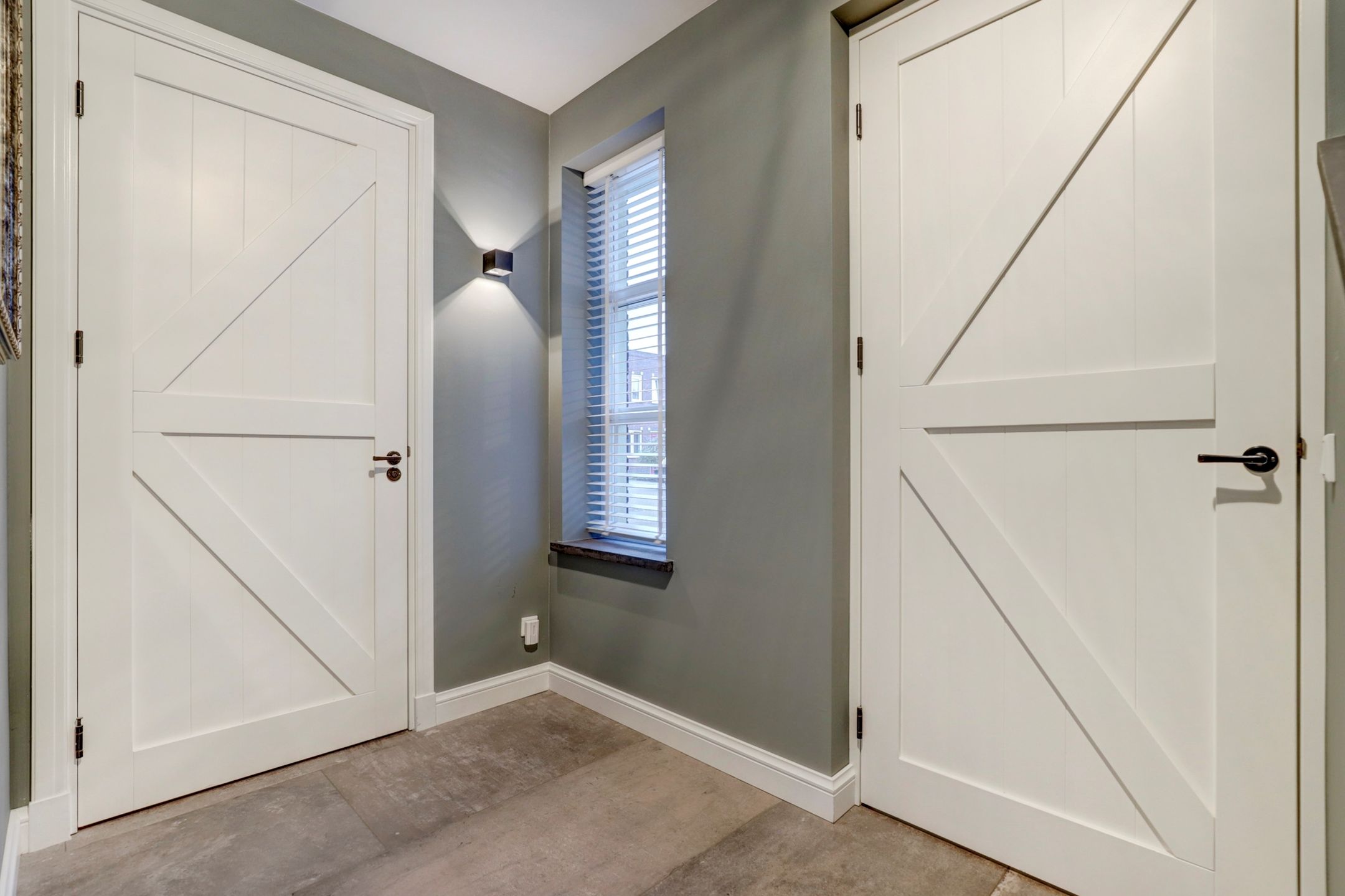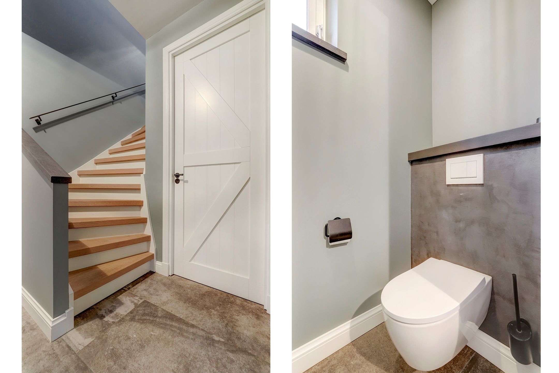 Als je bij deze woning aan komt rijden valt meteen de landelijke uitstraling op door de met hout beklede muren, de rode steen, dakkapellen en het donkere puntdak. Van binnen wordt deze landelijke stijl doorgetrokken in de deuren, ramen met roedes en houten vloeren gecombineerd met een strakke en stoere industriële inrichting. De voordeur ligt aan de zijkant van de woning. In de entree ligt de meterkast, een handige inbouwkast en om het hoekje bevinden zich de witgoedaansluitingen. In de entree liggen grote tegels van 120x60 cm waarvan er geen één er precies hetzelfde uitziet. De gehele begane grond is voorzien van vloerverwarming. Via de entree heb je toegang tot de hal die naar de keuken en woonkamer leidt en tot de multifunctionele ruimte. In de hal ligt een toiletruimte met wandtoilet, fonteintje en een klein raam. De trap die naar de verdieping leidt is bekleed met eikenvloerdelen. Onder de trap ligt een handige trapkast.