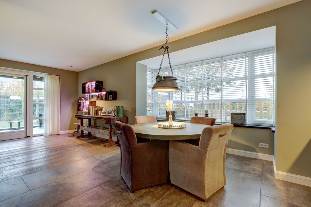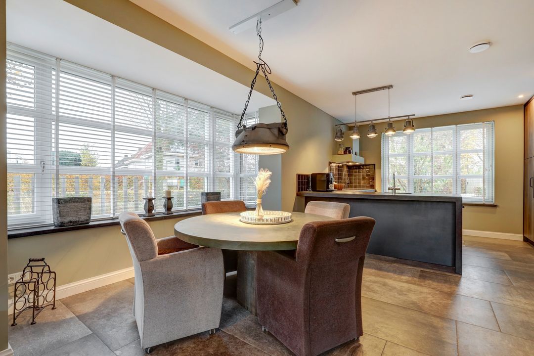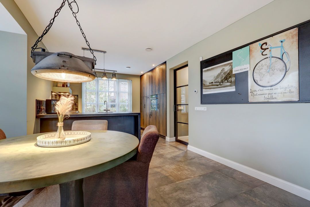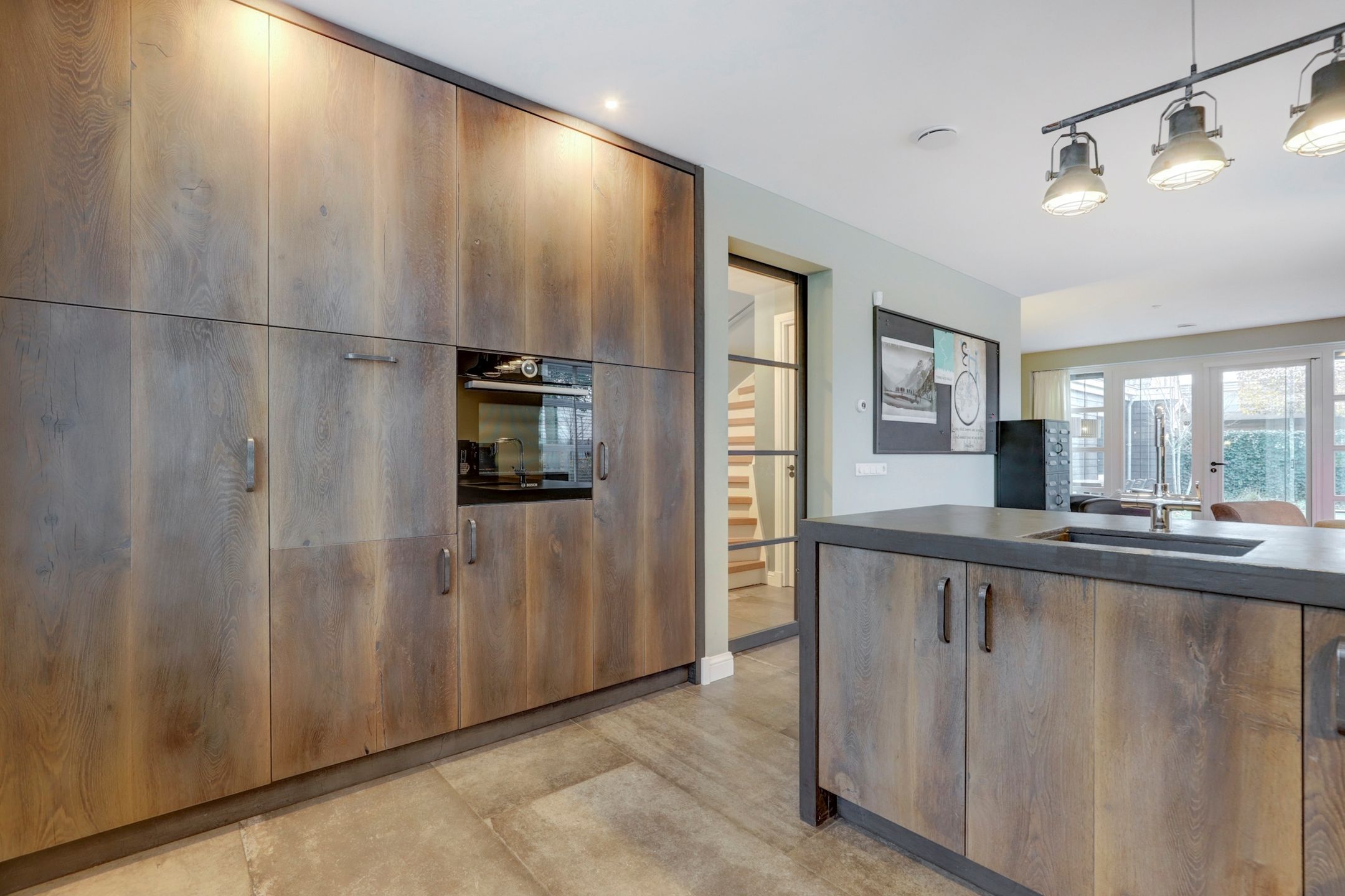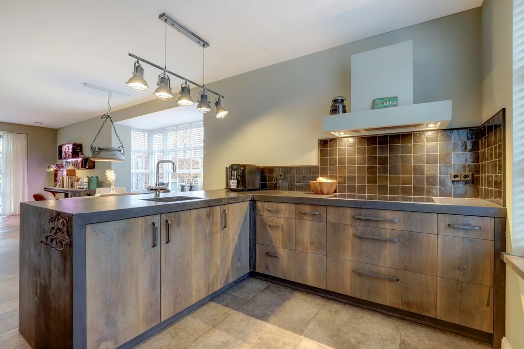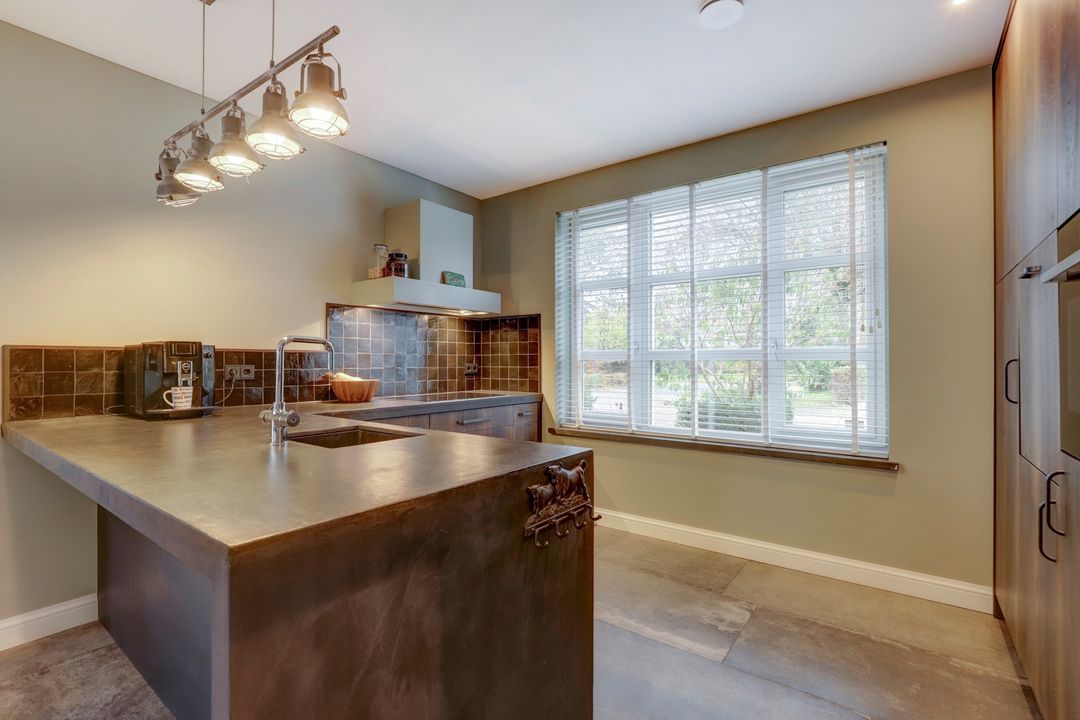 Via een stalen schuifdeur met glas loop je naar de keuken. Deze keuken is helemaal in industriële stijl ingericht met donkere kastjes en lades, een betonstuc werkblad en kleine tegeltjes tegen de achterwand. De keuken kan deze donkere kleuren goed hebben want de grote raampartij en de erker zorgen er voor dat er lekker veel licht naar binnen komt. In deze keuken ontbreekt het je aan niets! Je kunt koken op het vijfpits inductiefornuis of in de grote oven met stoomfunctie. Er is een vaatwasser aanwezig, een grote koelkast en een quooker kokendwaterkraan. In de vele lades en kastjes kun je met gemak al je potten, pannen, voorraad en keukengerei opbergen. Bij de erker kun je een grote eettafel kwijt waar je met de hele familie aan kunt eten.
