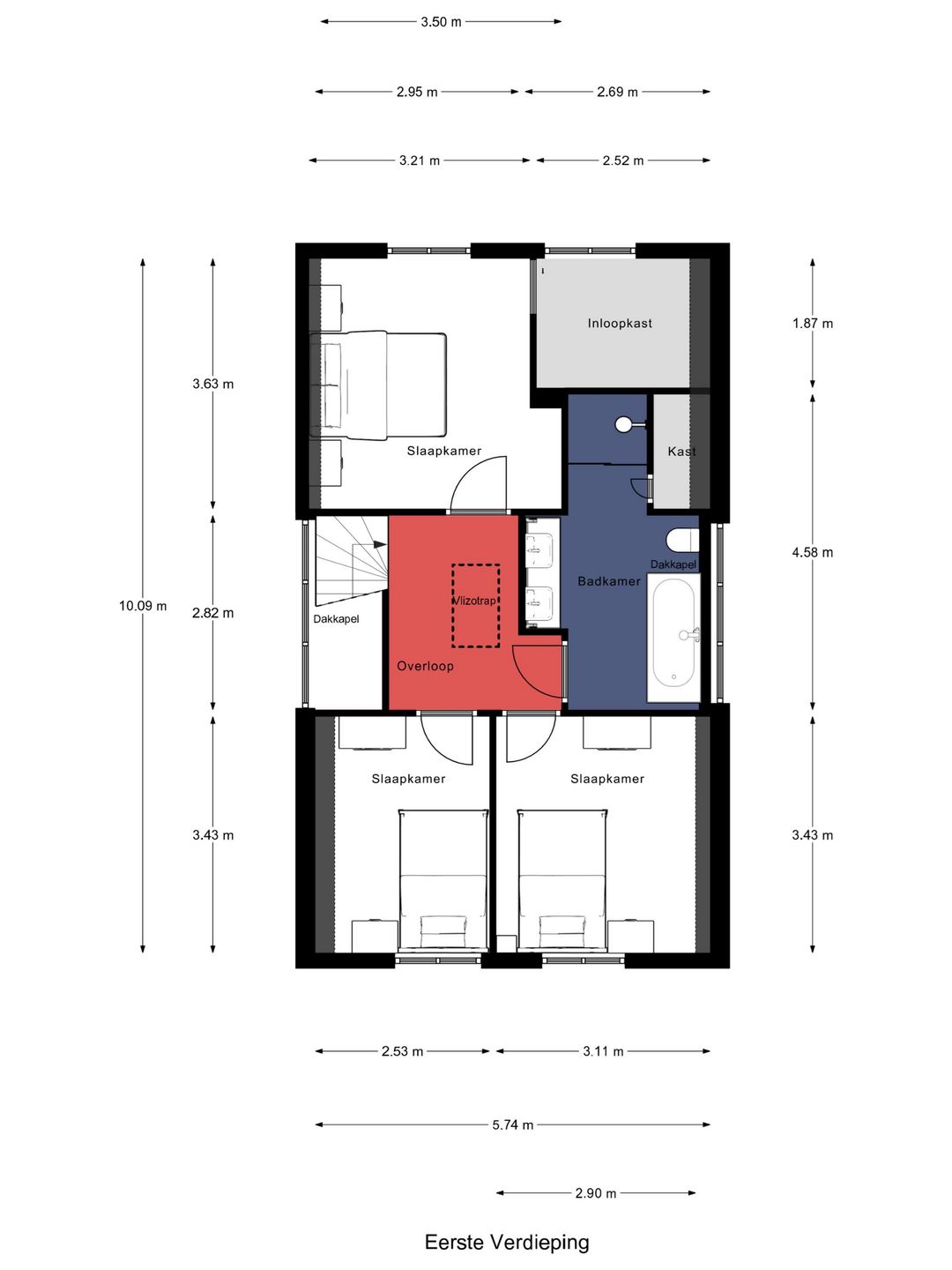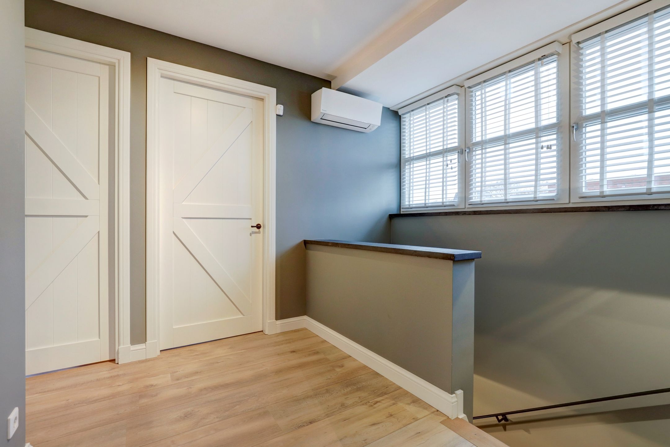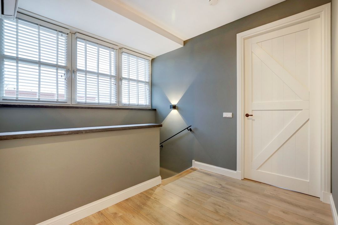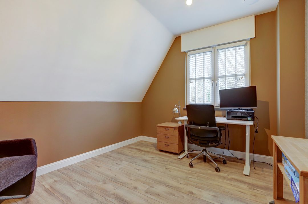 Op de eerste verdieping liggen drie slaapkamers en een badkamer. Op de overloop is een dakkapel aanwezig met drie ramen en een elektrisch rolluik waardoor het hier ook altijd lekker licht is. Er hangt een airco-installatie die in de zomer de verdieping lekker koel houdt en in de winter kan verwarmen. Zowel op de overloop als de slaapkamers ligt een laminaatvloer van extra brede planken.
