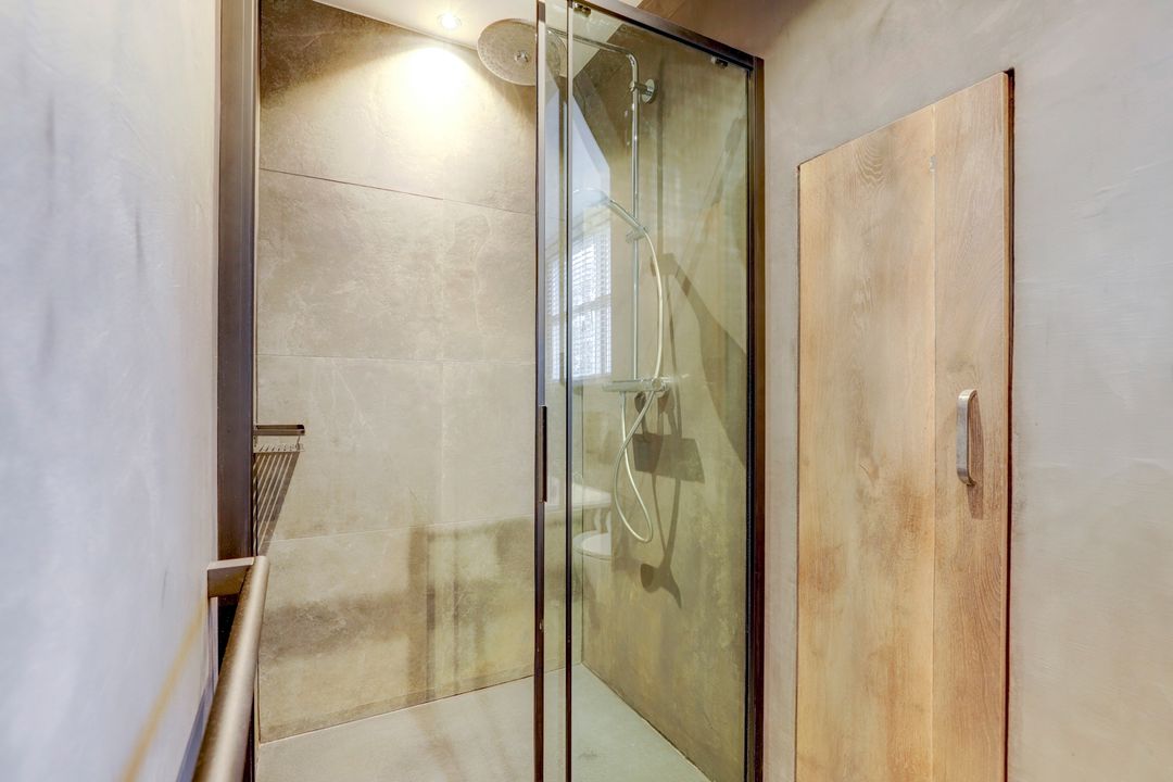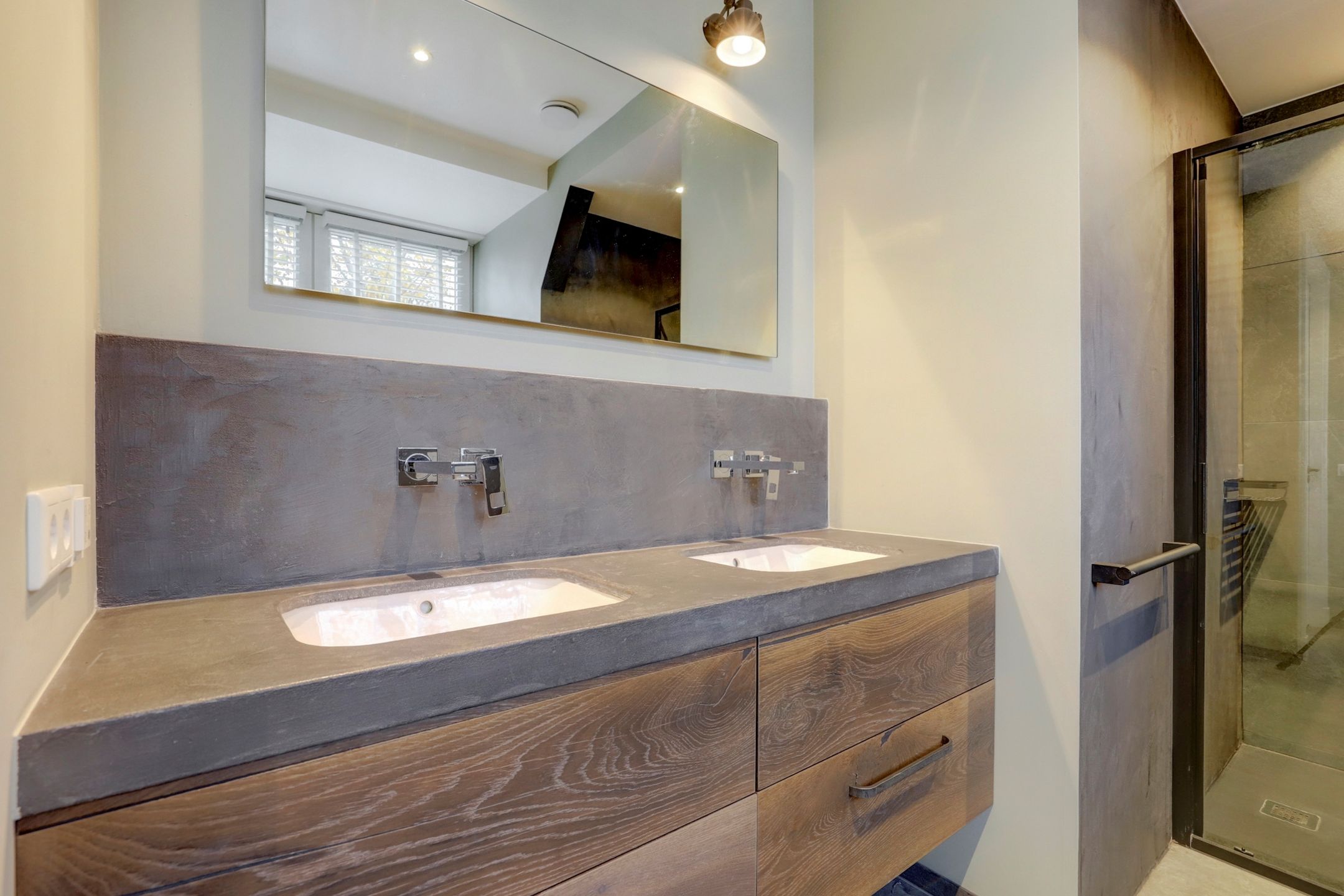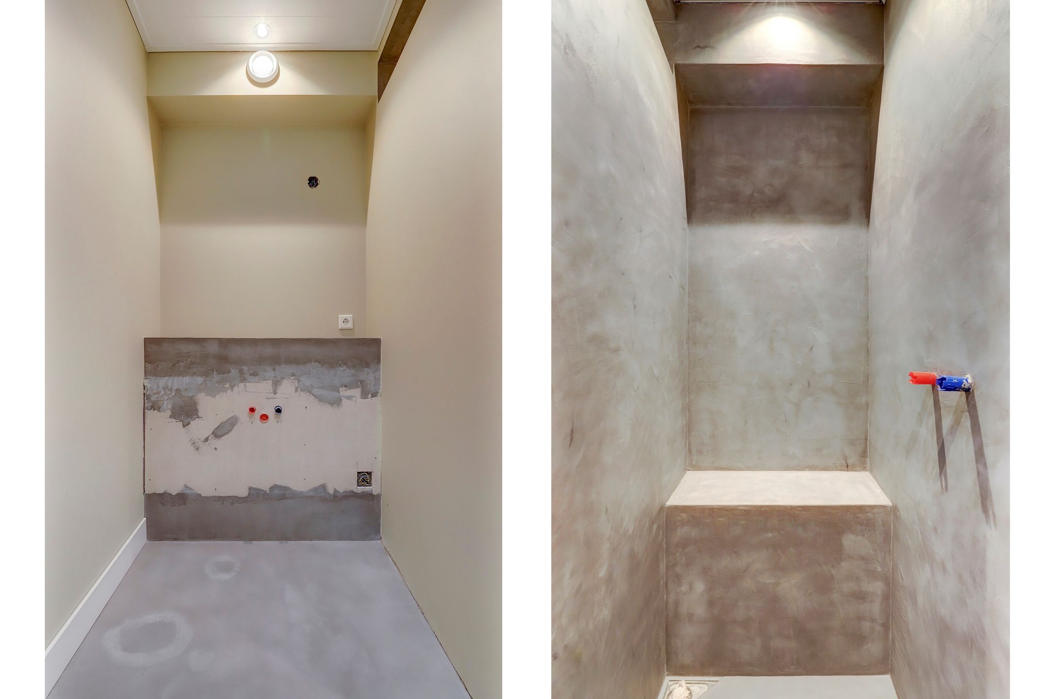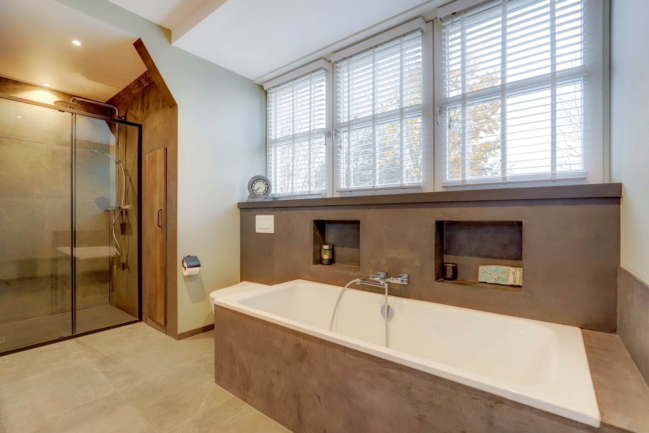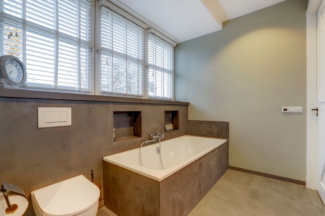 In deze royale badkamer kun je kiezen uit een heerlijk ligbad of lekker ontspannen in de ruime inloopdouche met glazen scherm. De badkamer heeft net als de keuken een industriële look gekregen door het robuuste wandmeubel met twee wasbakken en een betonstuc blad. Achter het bad zijn twee nissen gemaakt in betonstuc en ook rondom het bad komt dit weer terug. Er is verder een toilet aanwezig, een grote dakkapel met drie ramen met elektrisch rolluik en een handige muurkast. De vloer is voorzien van vloerverwarming en achter de spiegel zit elektrische verwarming.
