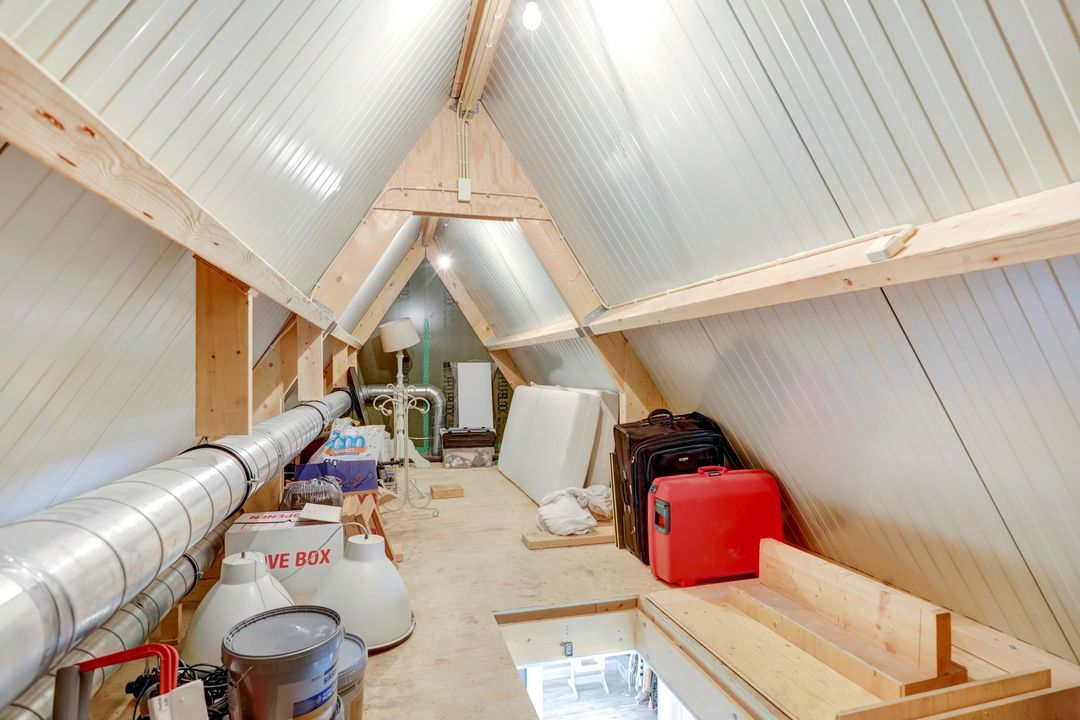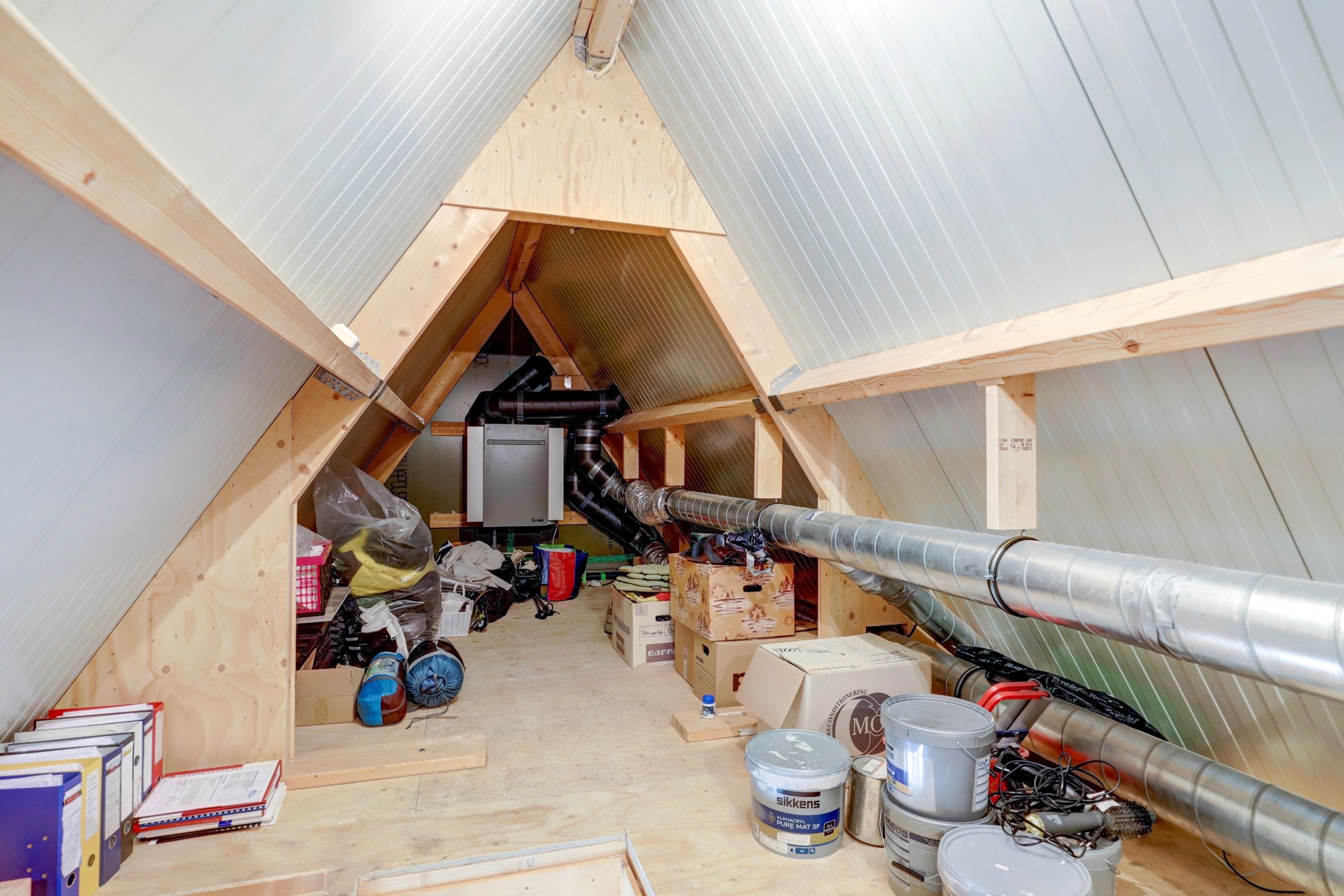 De zolder is te bereiken met een vlizotrap via een luik boven de overloop en hier beschik je over veel ruimte om spullen op te bergen die je niet zo vaak nodig hebt. De wtw-installatie hangt ook op de zolder.