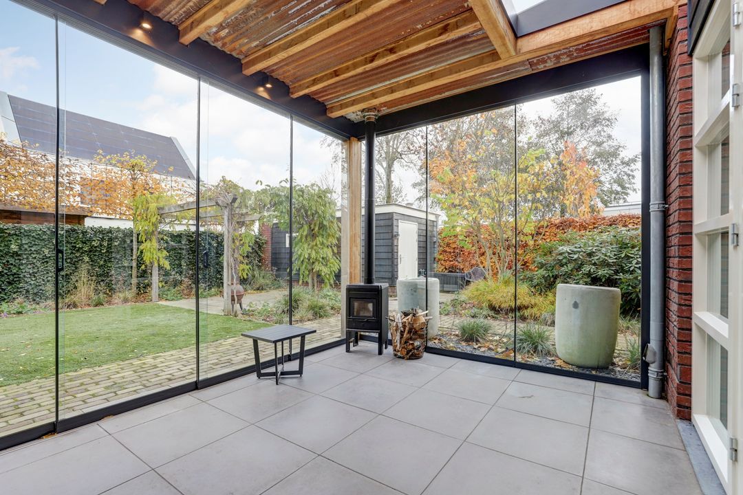 De tuinkamer voelt ook echt als het verlengde van de tuin! Door de glazen panelen, die je in de zomer helemaal aan de kant kunt schuiven, en de grote lichtstraat in het plafond haal je als het ware buiten naar binnen toe. In de winter zorgt de houtkachel er voor dat je hier ook aangenaam kunt zitten.