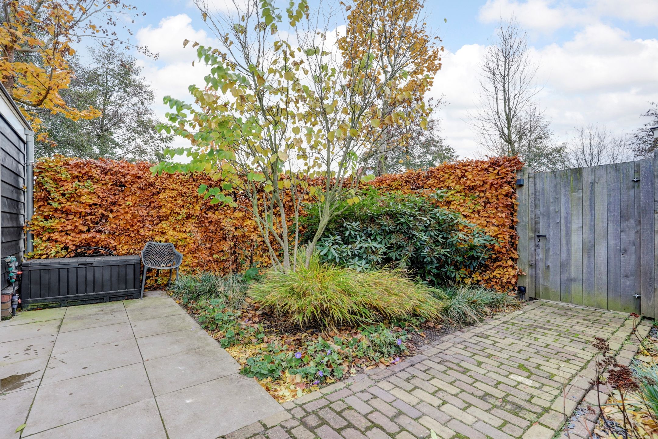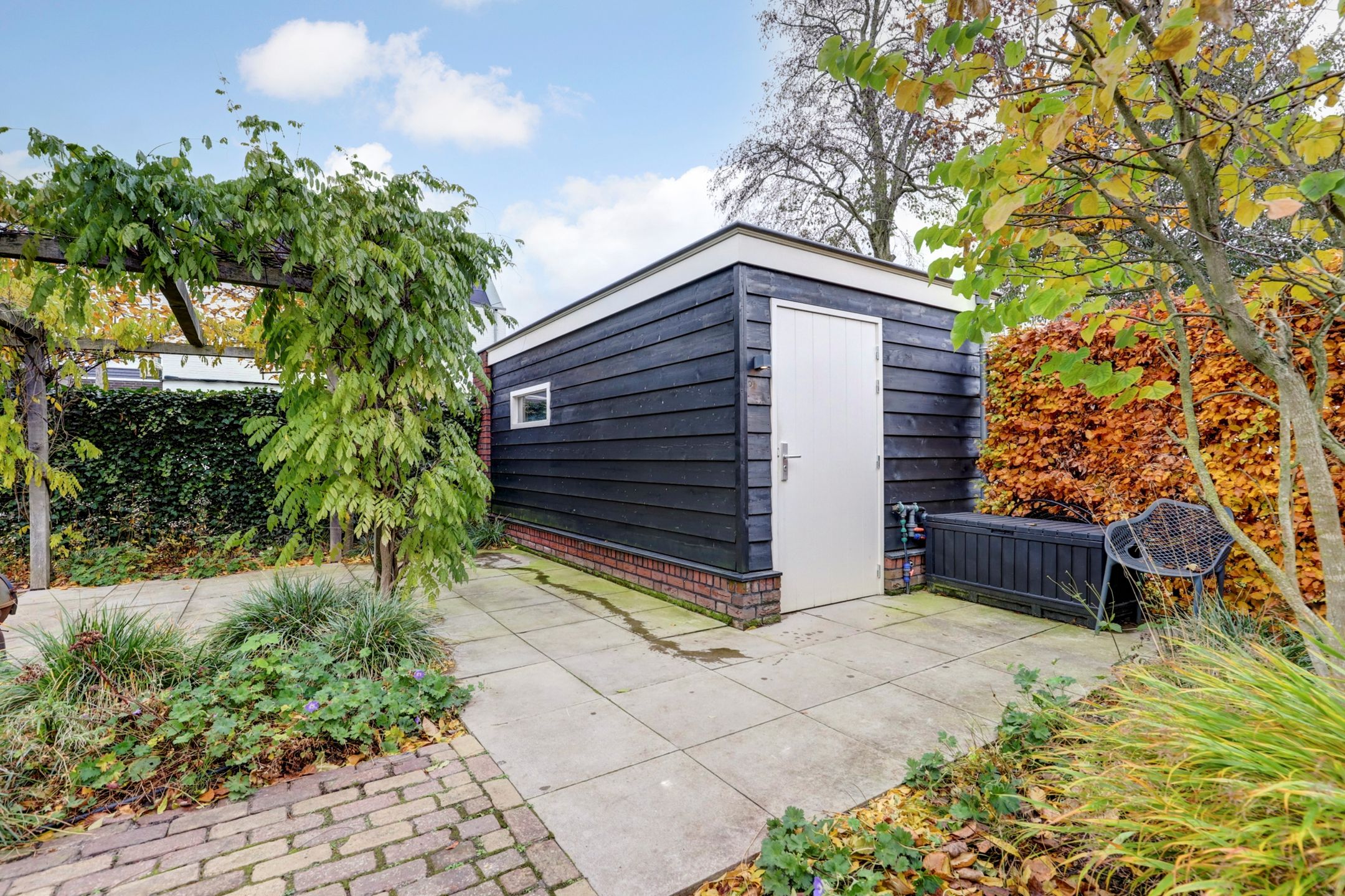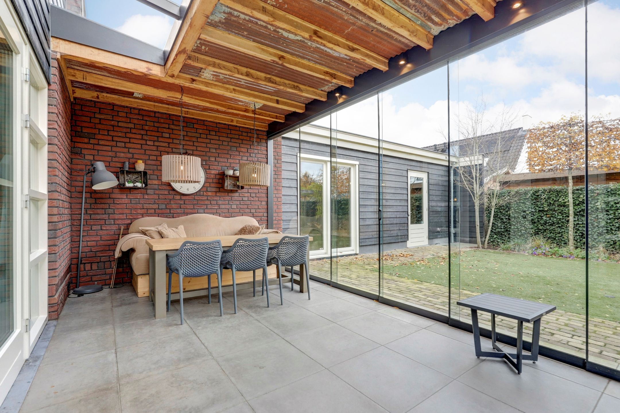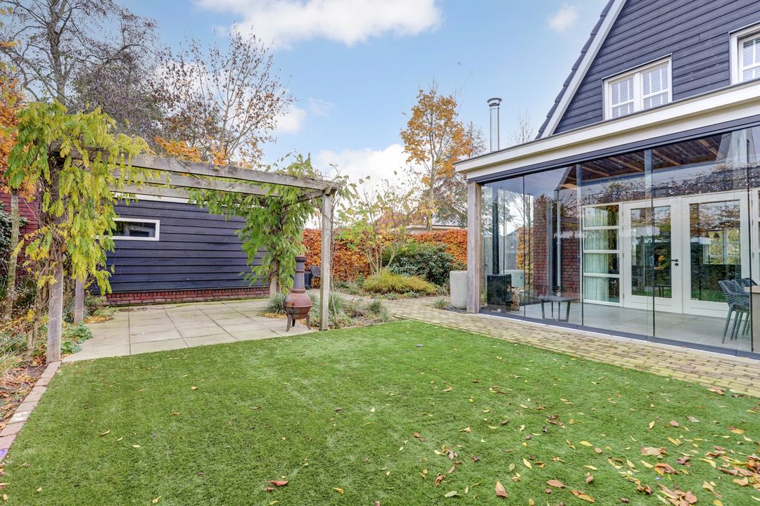 In deze achtertuin heb je geen last van inkijk! Doordat de woning op de hoek van de straat ligt was de inkijk al minimaal en achterin de tuin staan enkele leibomen die voor nog meer privacy zorgen. In de zomer schuif je de glazen panelen van de tuinkamer helemaal open zodat het gelijk fungeert als een overdekt terras. Zelfs als het nog wat fris is kun je hier al lekker bij de houtkachel zitten. De tuin is mooi groen aangelegd maar makkelijk te onderhouden vanwege het kunstgras, de siergrassen in de borders en een druppelsysteem dat aangesloten is op de grondwaterpomp en de tuin zo mooi groen houdt. Achterin de tuin ligt een grote berging die geheel geïsoleerd is en voorzien van elektra. De tuin heeft een vrije achterom aan de zijkant van de woning en is geheel omheind. Er zijn diverse stopcontacten aanwezig, verlichting en een buitenkraan.