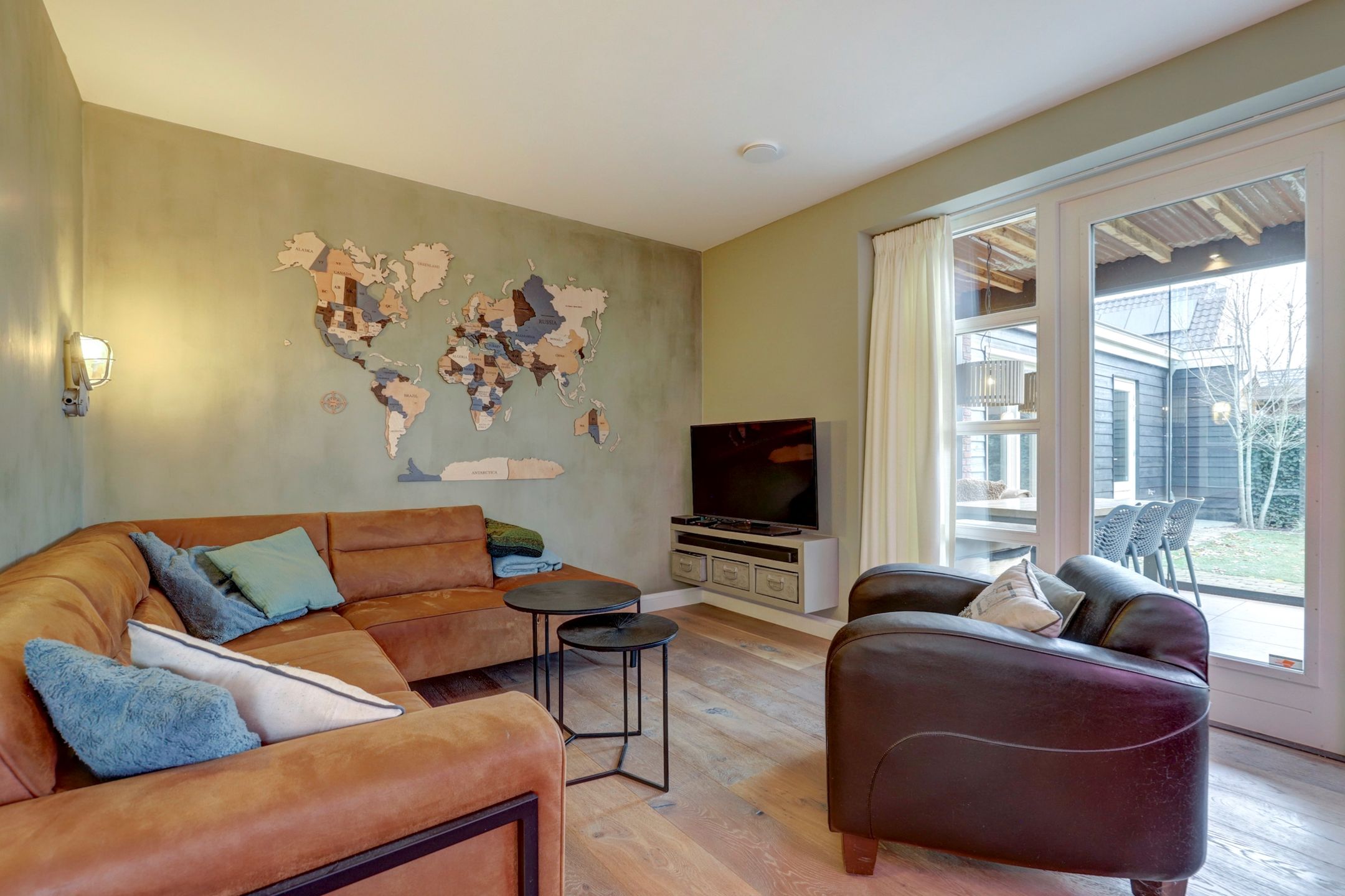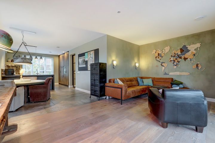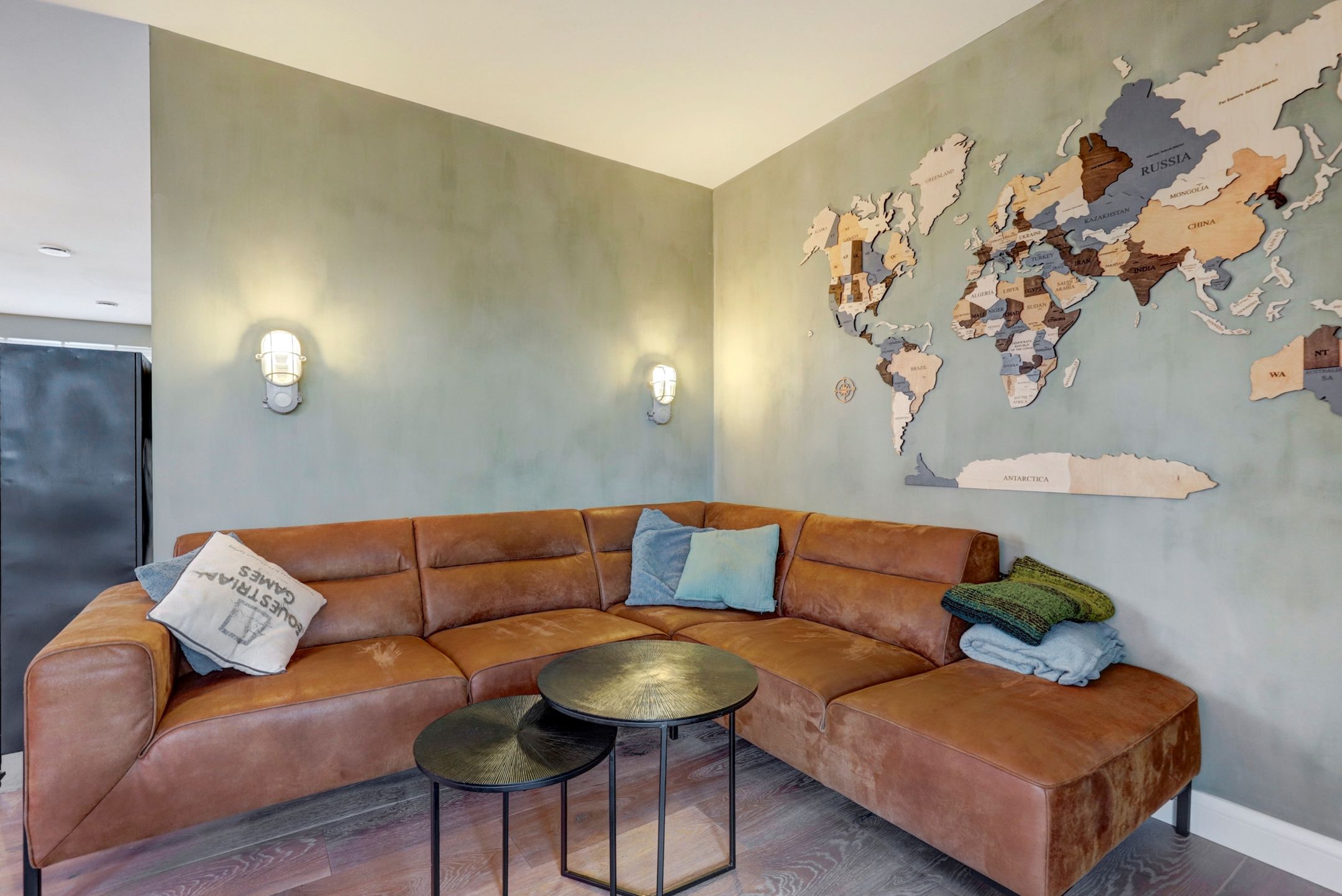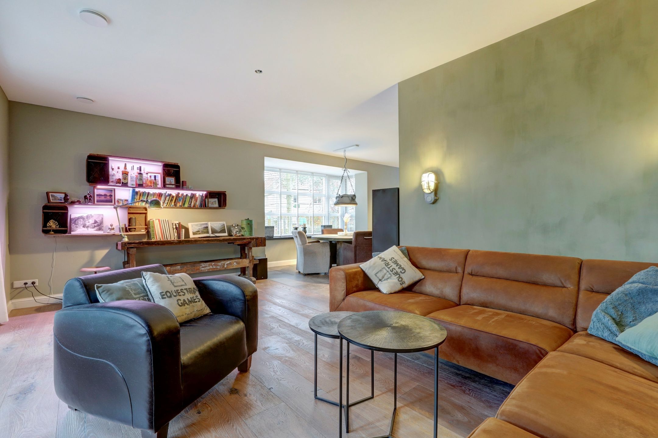 De woonkamer heeft een prachtige verlijmde eikenhoutenvloer van extra brede planken. Enkele wanden zijn in een betonlook geverfd om ook hier de industriële look door te trekken en de openslaande deuren naar de tuinkamer geven juist weer dat landelijke gevoel.
