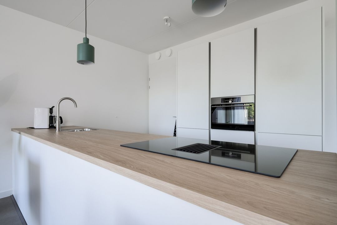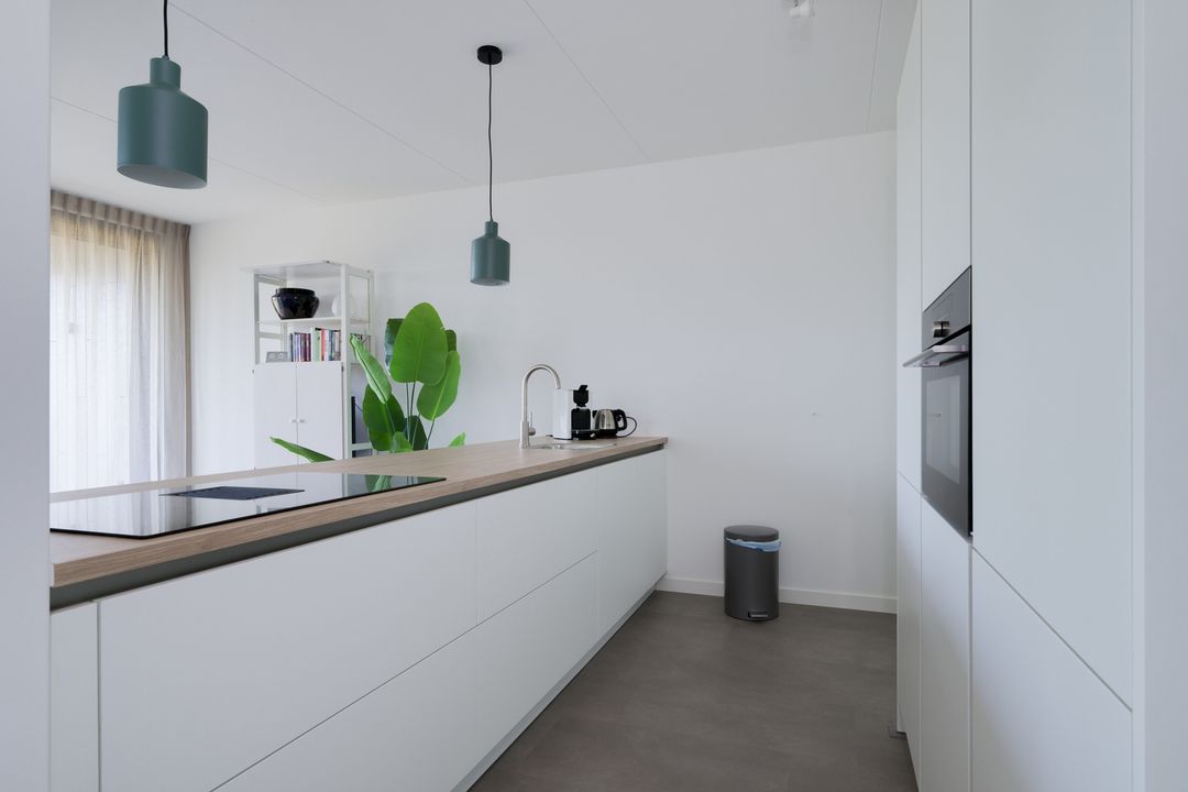 De witte kastfronten in combinatie met het kunststof werkblad geven de keuken een frisse, tijdloze uitstraling. Alle benodigde apparatuur is aanwezig: een inductiekookplaat met geïntegreerde afzuiging (geen storende afzuigkap in het zicht), koel-vriescombinatie, vaatwasser, combimagnetron en een praktische boiler. De doordachte indeling zorgt ervoor dat alles binnen handbereik is tijdens het koken.