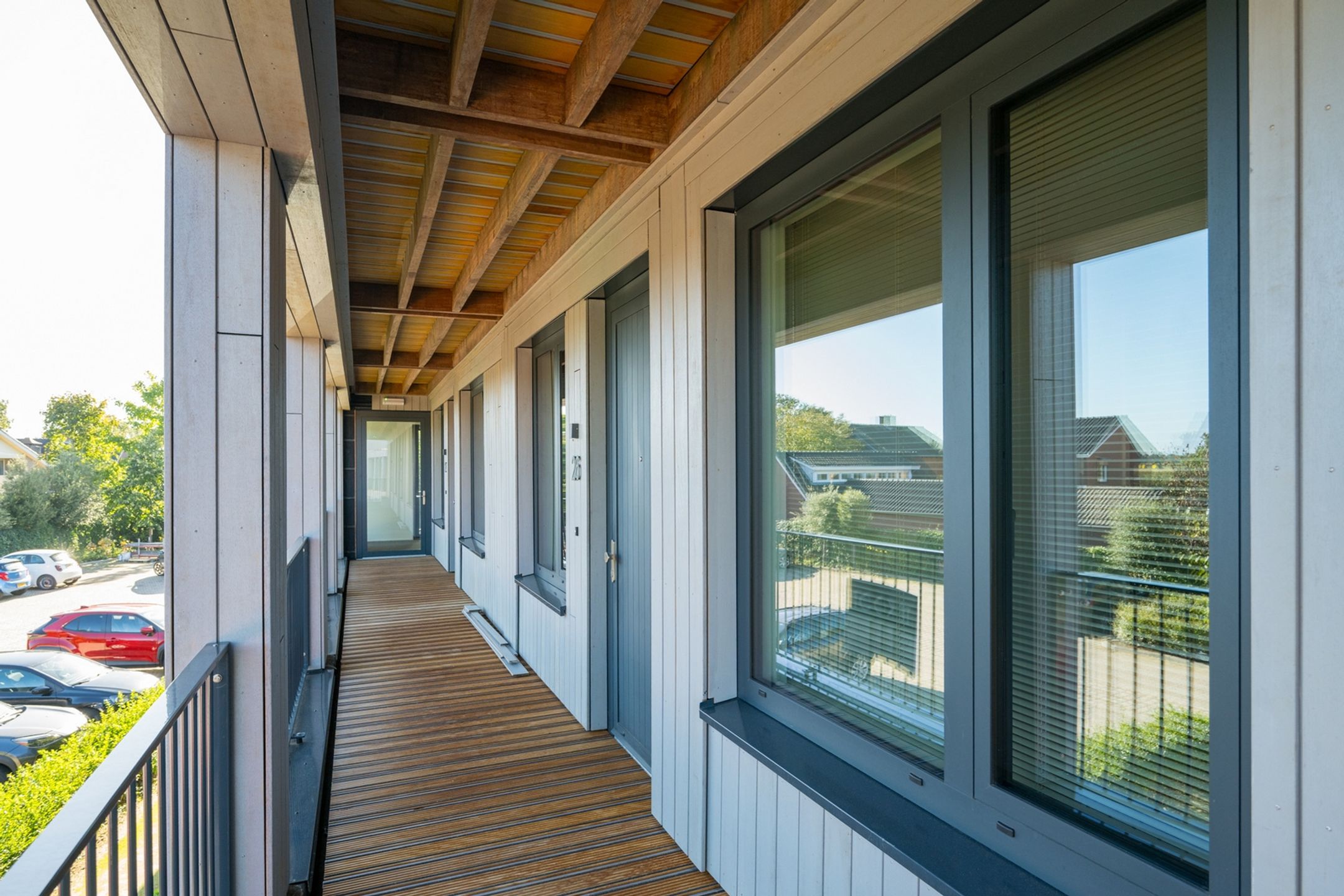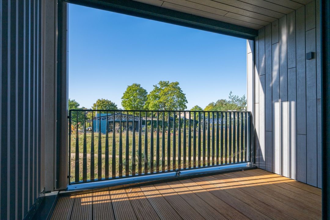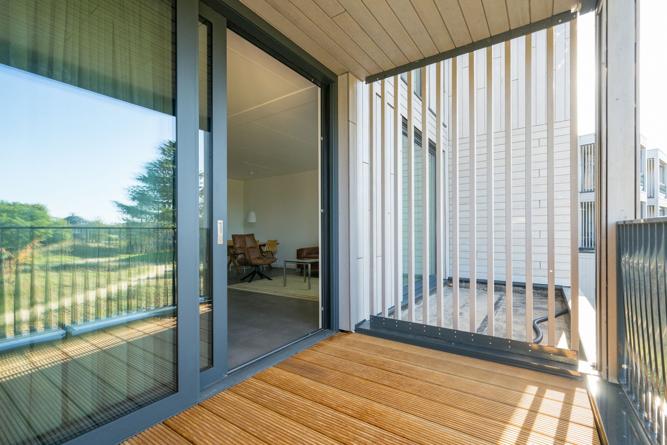 Het overdekte balkon is een heerlijk verlengstuk van uw woonruimte. Via de schuifpui vanuit de woonkamer stapt u zo het balkon op, dat is afgewerkt met fraai houten vlonders. De overkapping biedt beschutting tegen zon en regen, waardoor u hier het hele jaar door kunt genieten. Het balkon kijkt uit over de gezamenlijke groene tuin en biedt voldoende ruimte voor een gezellige zithoek.