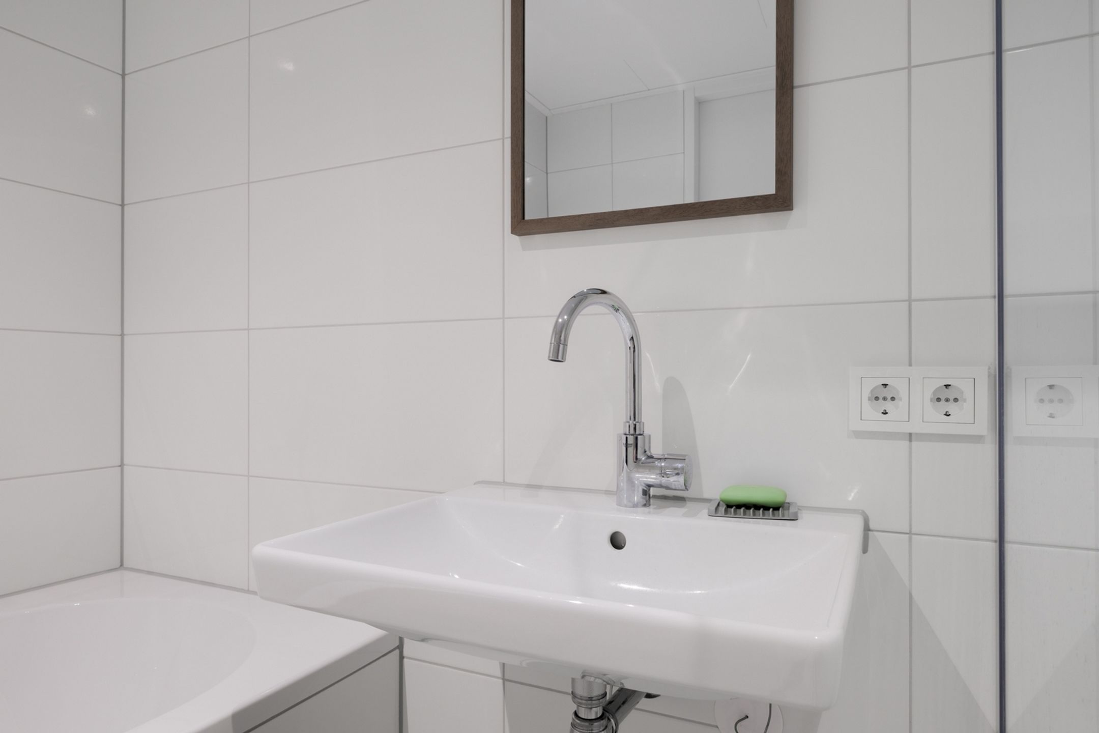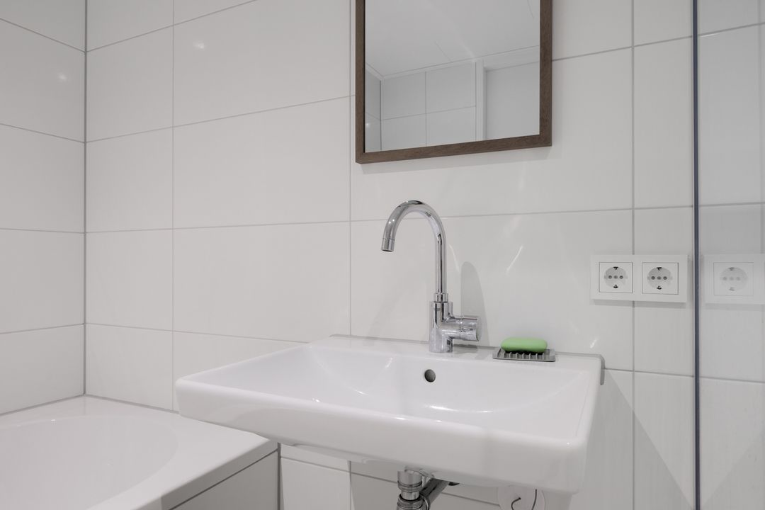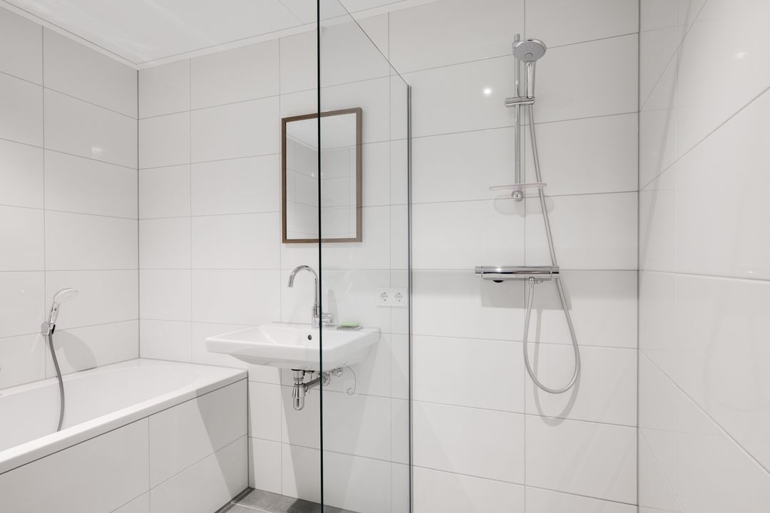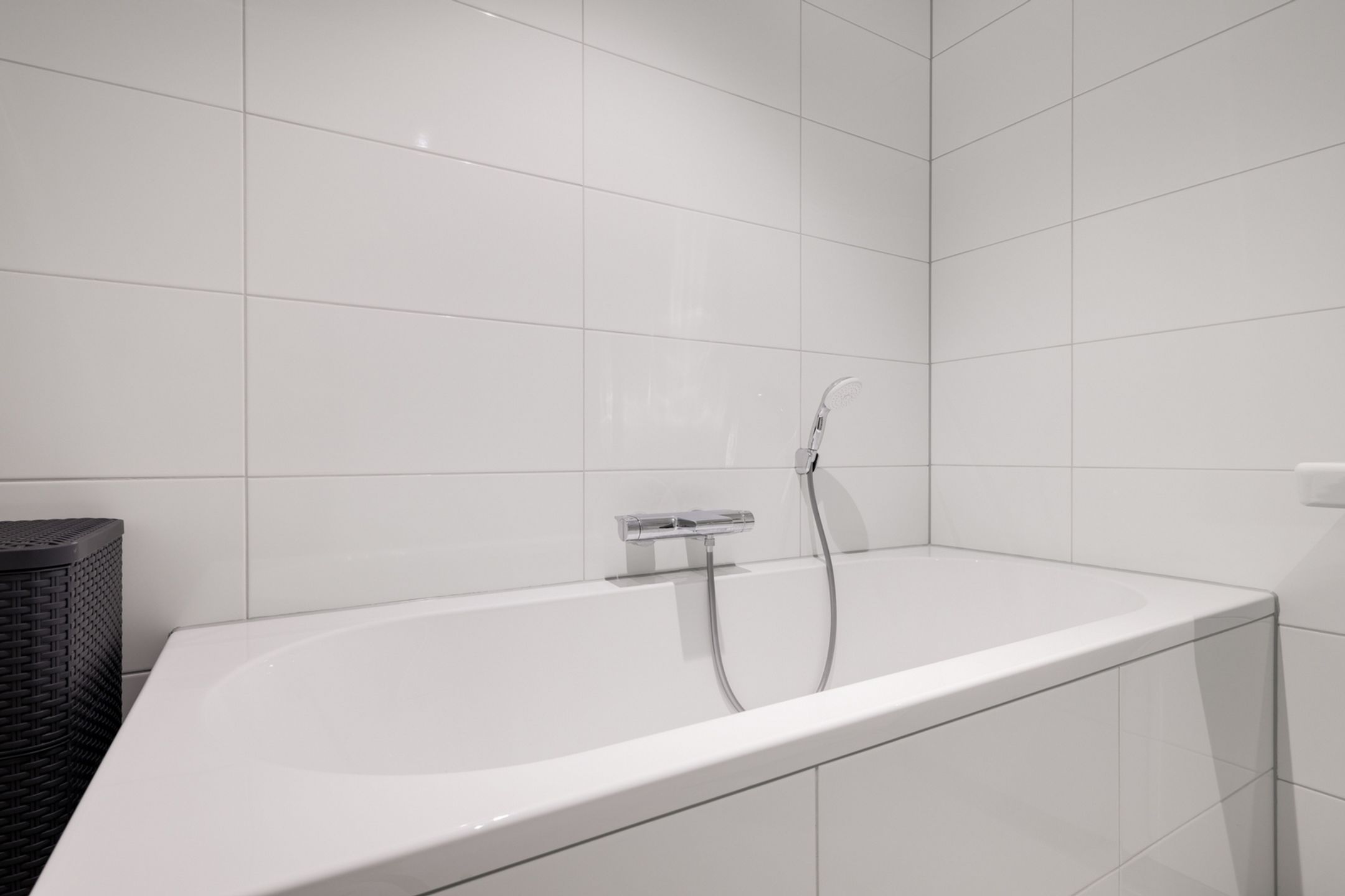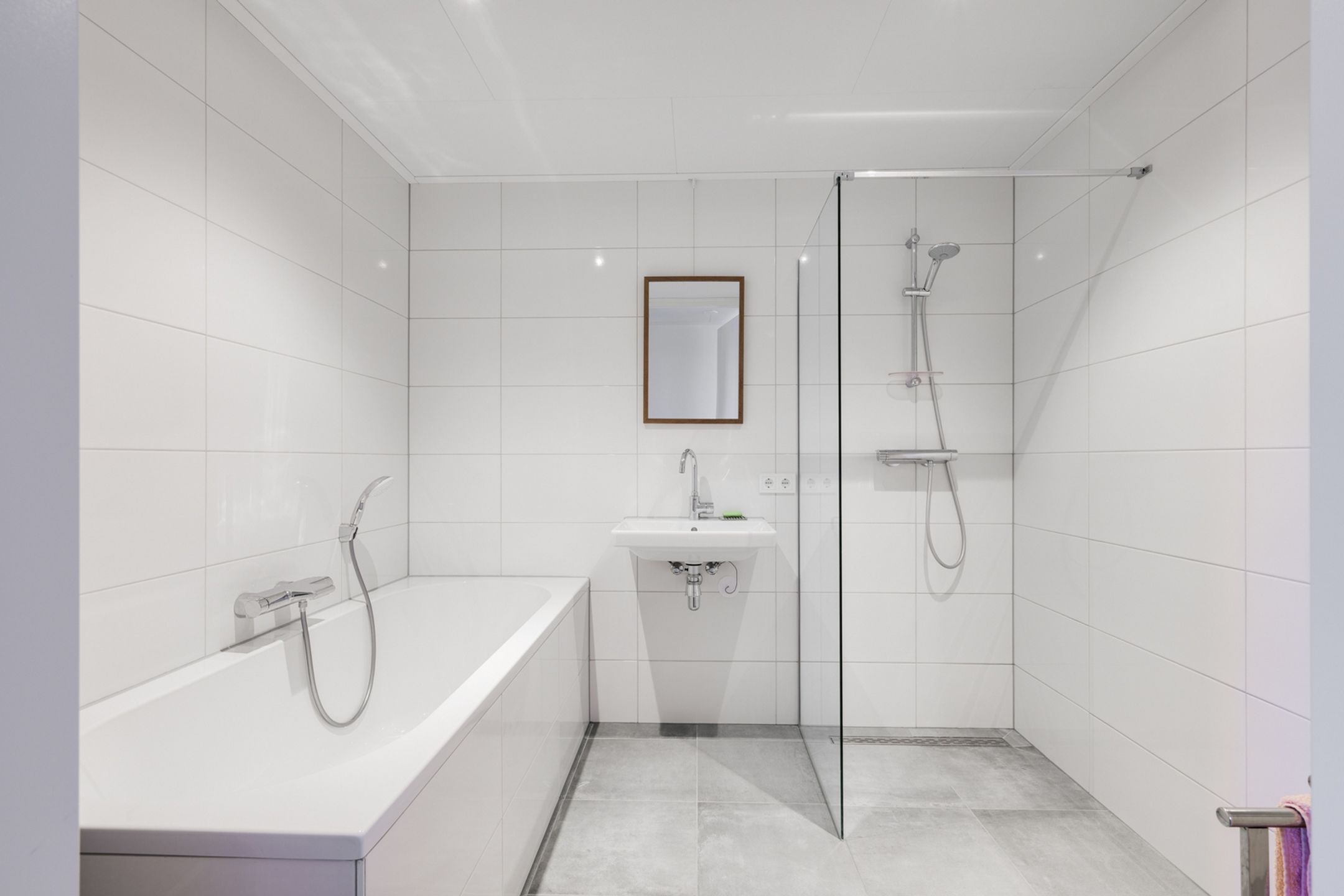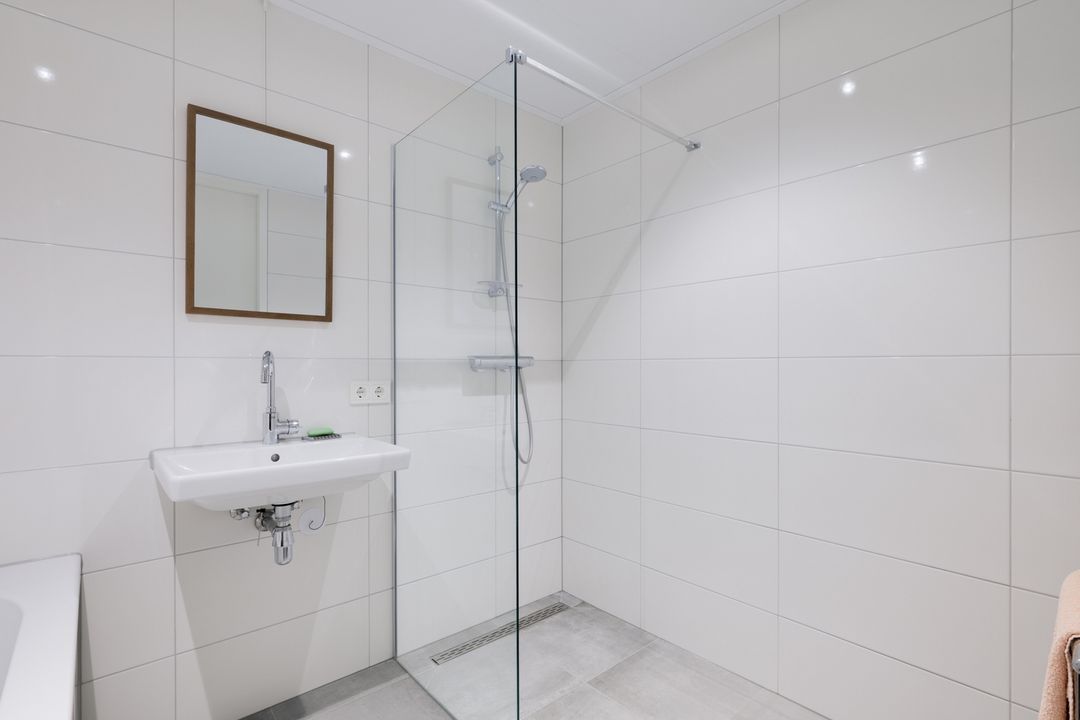 De luxe badkamer is volledig betegeld in strakke witte wandtegels met een grijze vloertegel. Deze ruimte biedt zowel een ligbad als een inloopdouche met glazen wand. De compacte wastafel met spiegel maakt het geheel compleet. Tevens is er vloerverwarming en mechanische ventilatie aanwezig.