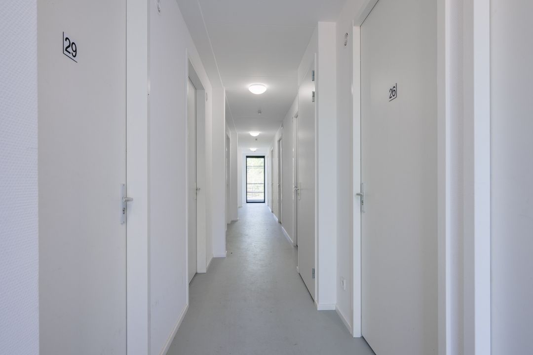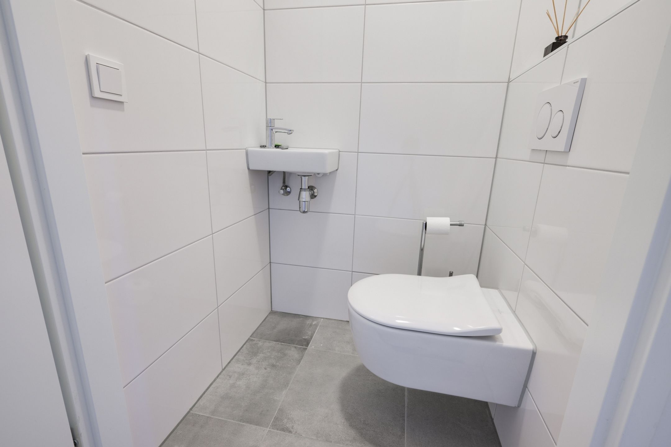 Via de centrale entree van het complex, voorzien van brievenbussen, bereikt u met de trap of lift de eerste verdieping waar dit appartement zich bevindt. De hal van het appartement biedt direct toegang tot alle vertrekken en is afgewerkt met een strakke PVC-vloer die doorloopt in de gehele woning. Hier vindt u ook het moderne toilet met wandcloset en fonteintje, uitgevoerd in witte wandtegels met een grijze vloer.